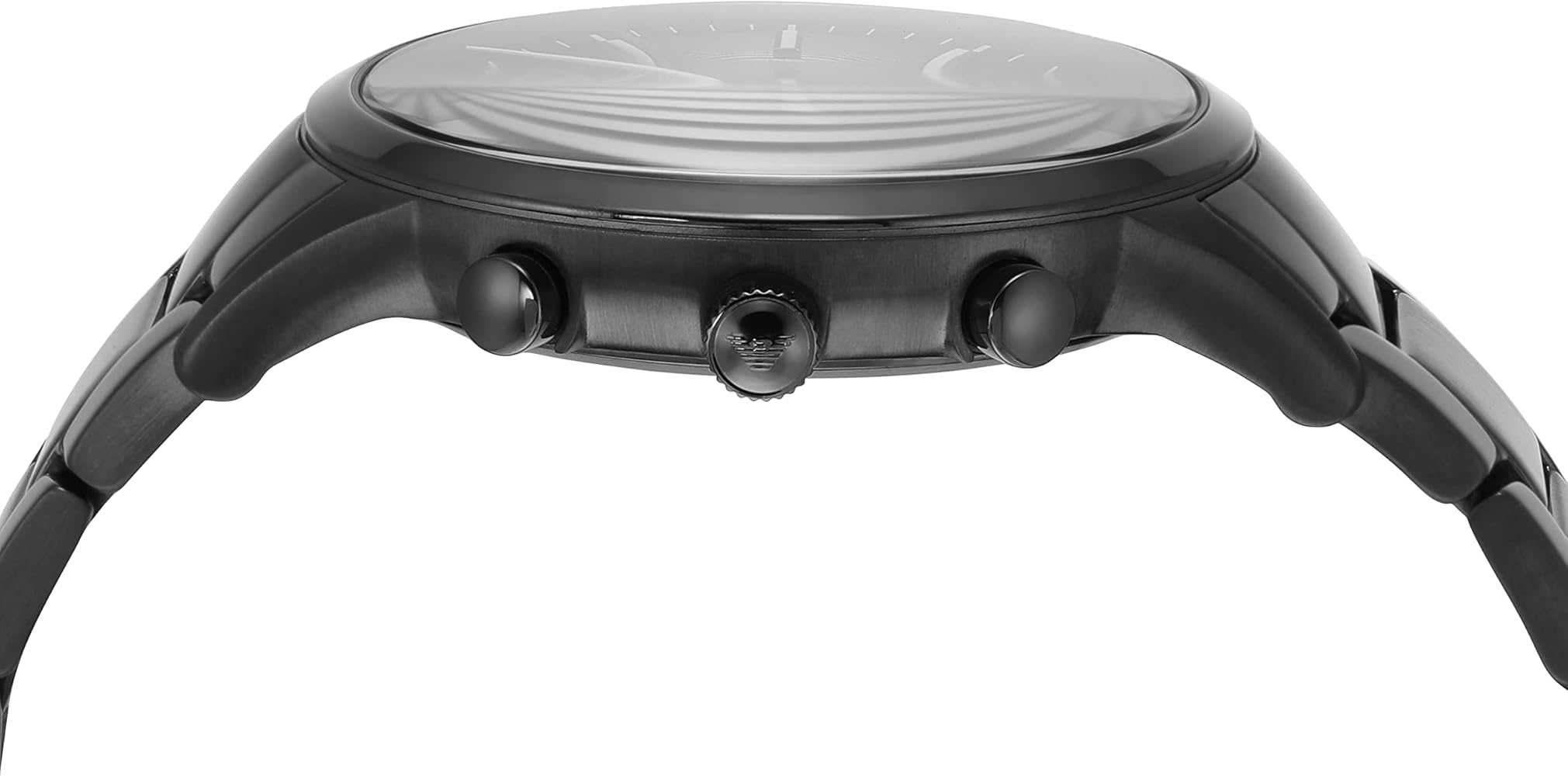 Emporio Armani watch featuring a 43mm diameter case with over 50% recycled stainless steel The sunray dial features a gradation of color changing from black to gray, and the outer CD finish dial ring combined with a gunmetal bracelet made from over 50% recycled stainless steel.