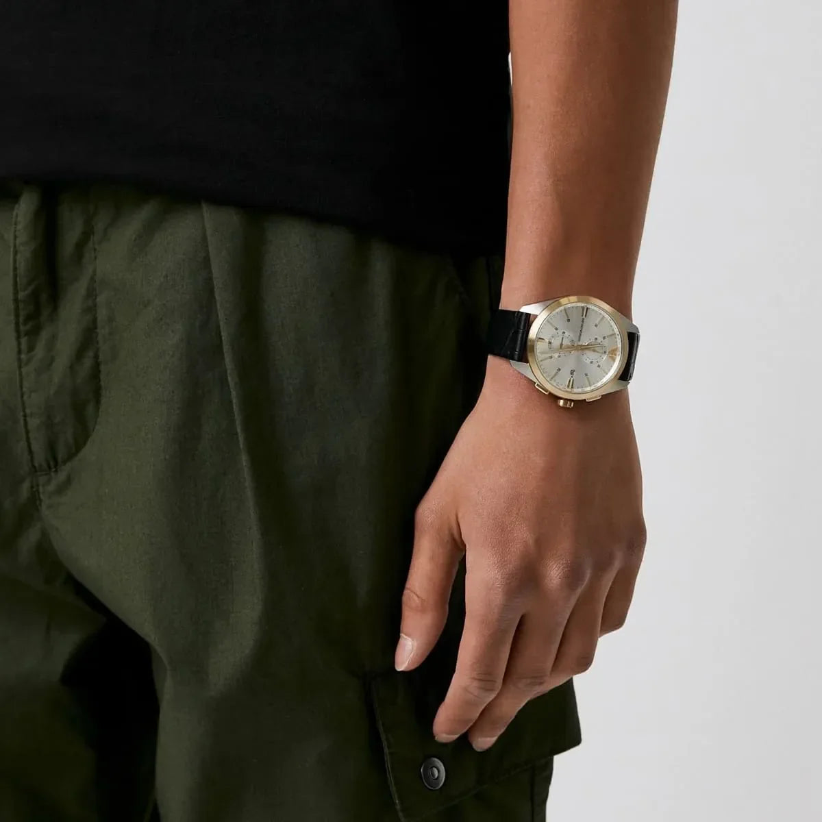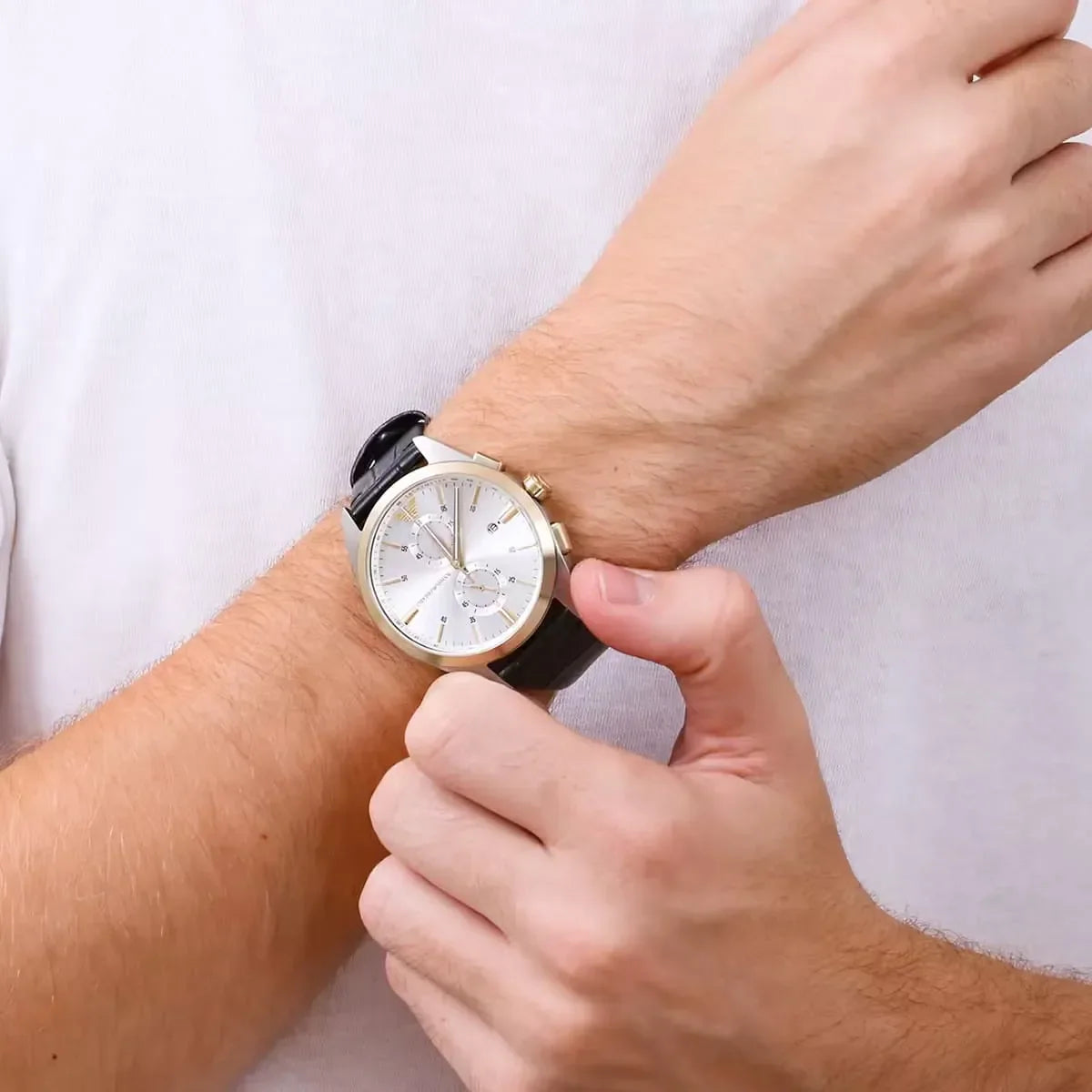The Emporio Armani AR11498 watch combines a 43mm round shaped stainless steel case and black leather strap with a traditional buckle. It has a white analogue dial with date display, chronograph sub-dials, a tachymeter scale which is protected beneath mineral crystal glass. Power is generated by the quartz movement. This model also has a water resistance of up to 50 metres.