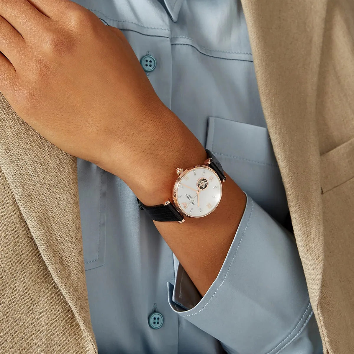 Emporio Armani women's automatic watch. Clock with round case of 34 mm made of stainless steel of rose gold color, with glossy finish. The thickness is 11 mm. The glass is transparent. The dial is mother of pearl. The distance of the anse is 14 mm. There are crystals on the dial. The strap is in black pro-planet leather with a shiny finish.
