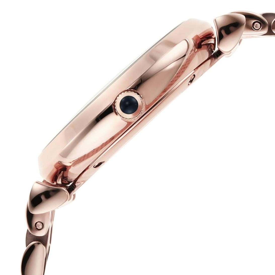 It has a blue and sparkling stone set analogue dial with rose gold tone hands & roman numerals which are protected beneath a mineral crystal glass. Power is generated by the quartz movement. This model also has a water resistance of up to 30 metres.
