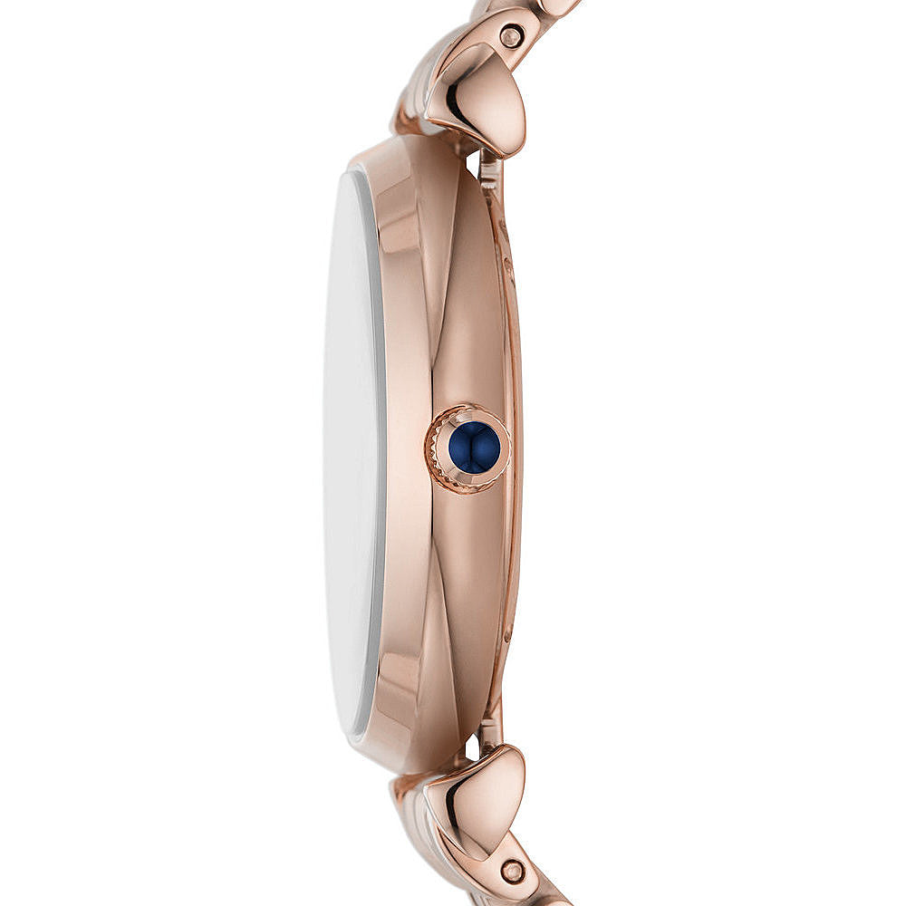 The Emporio Armani Ladies Gianni T-Bar AR11423 watch combines a 32mm round shaped rose gold tone stainless steel case and rose gold tone stainless steel bracelet with a push button deployment clasp.