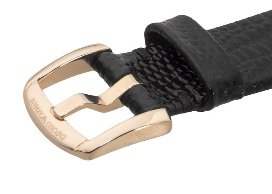 Emporio Armani watch featuring 24x35mm case with two-hand movement Mother-of-pearl dial with rose gold-tone hands and black leather strap