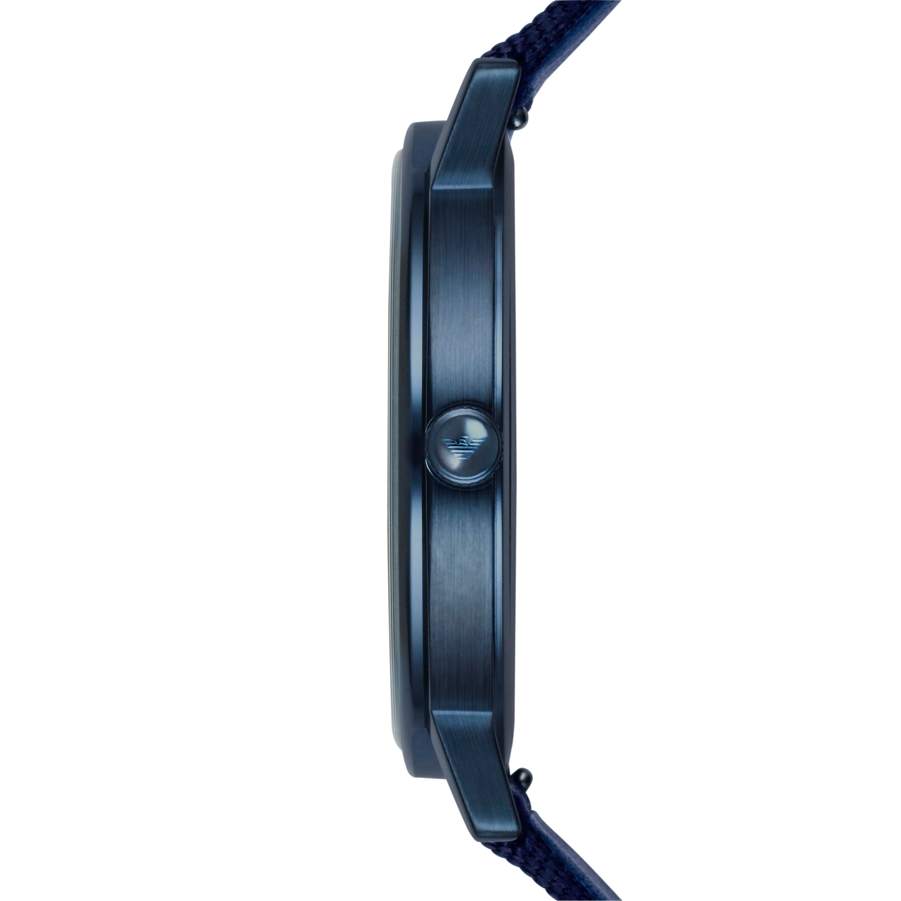 The nautical striper, casual raven black coated timepiece is trendy and sporty. This men's Emporio Armani watch gleams with a matte white dial and black IP case and crown. The round 41mm dial with a coated blue case and needle buckle is a travel watch set for the holiday lover in you.