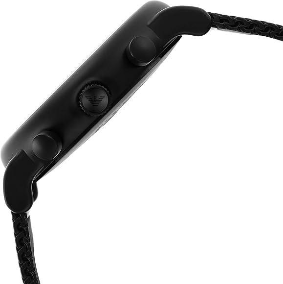 The watch is secured using a black plated stainless steel mesh bracelet.