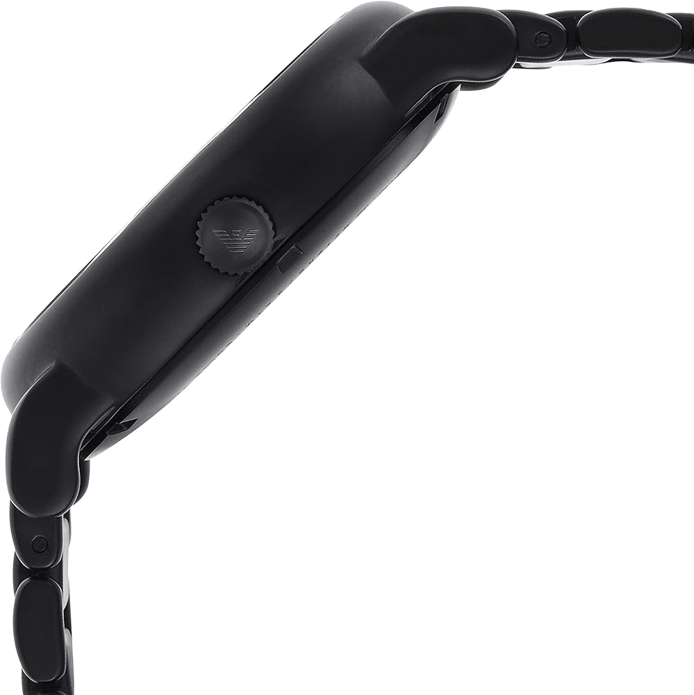 Emporio Armani's 43mm watch features a black matte dial with black stick indexes, skeleton automatic movement and black stainless steel bracelet.