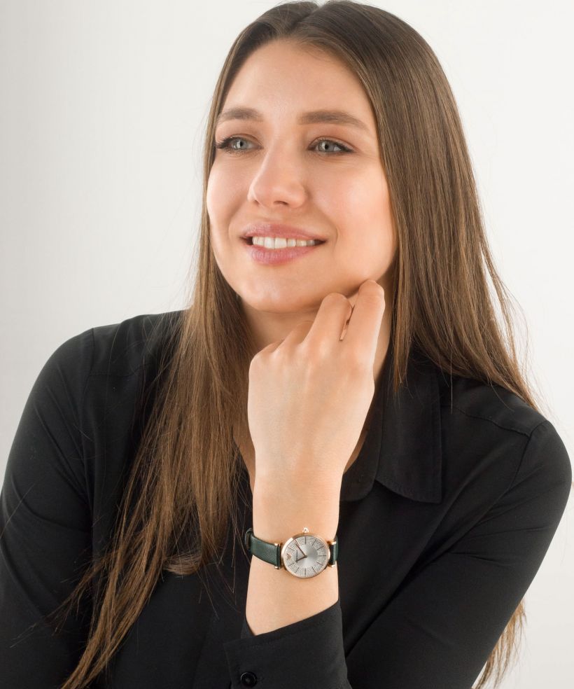 Emporio Armani's 32mm watch features a silver glossy sunray dial, two-hand movement, rose gold-tone at least 50% recycled stainless steel case and green leather strap.