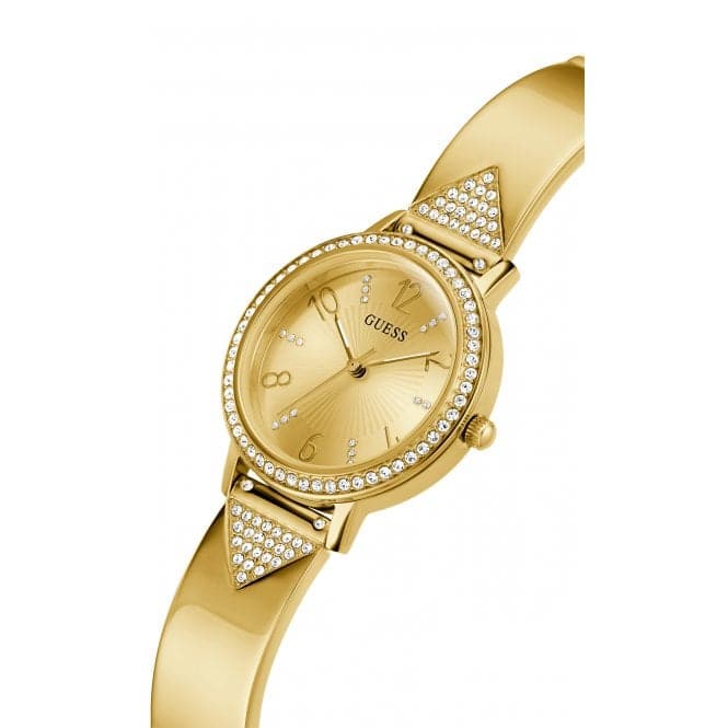 Crafted from high-quality stainless steel, the case and band showcase a beautiful gold tone finish that radiates glamour. The watch features a chic bangle style adorned with a unique triangle glitz connection on either side, making it the perfect petite sizing for any wrist. Its eye-catching champagne sunray dial adds a touch of warmth and richness, ensuring that you will always make a stylish impression.