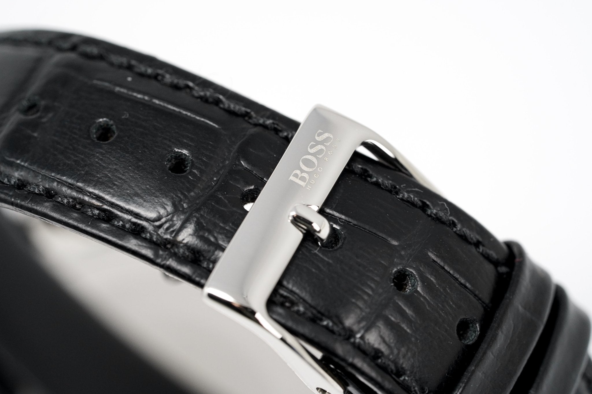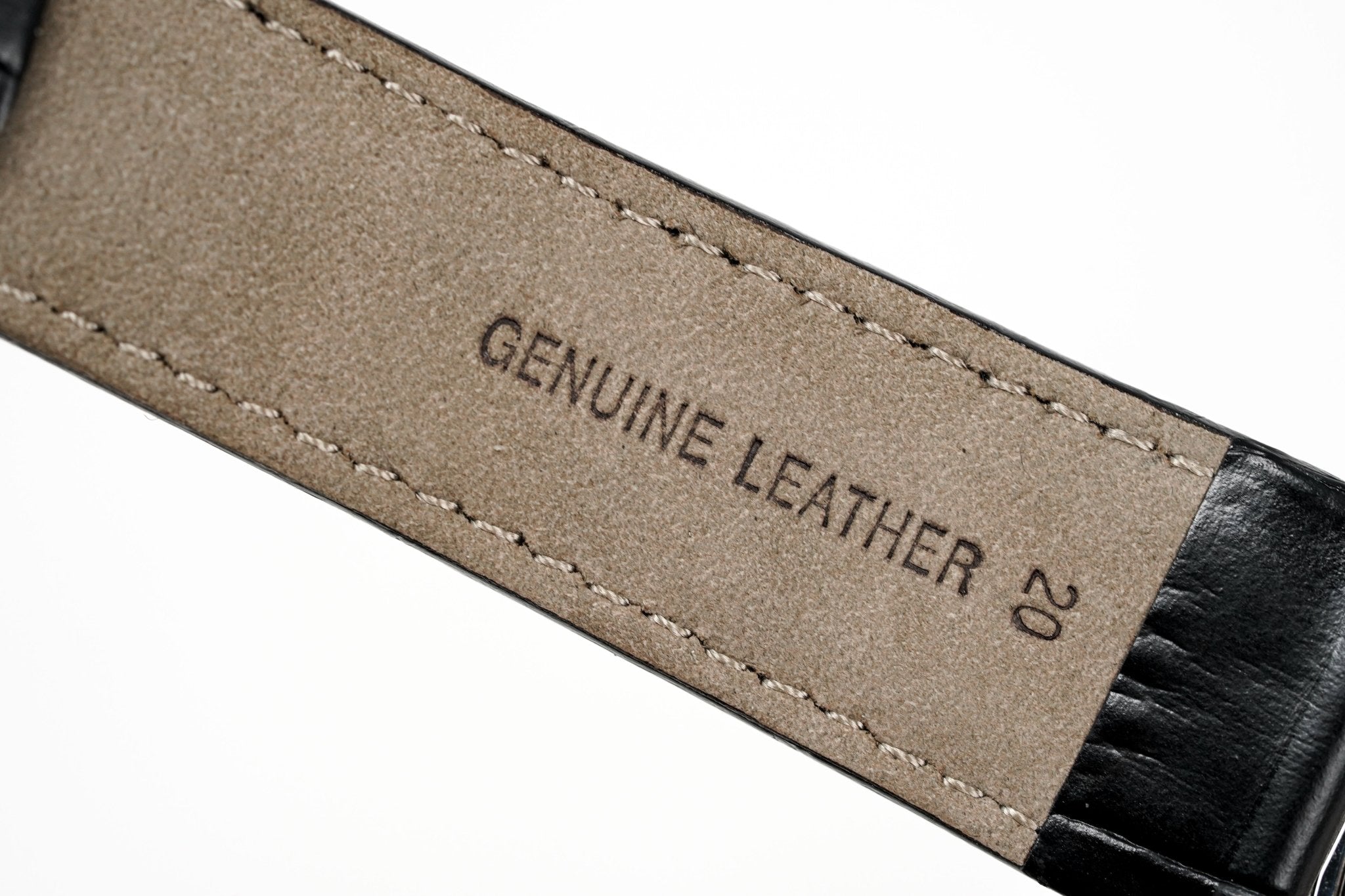 Black Leather Strap With Stainless Steel Pin Buckle.