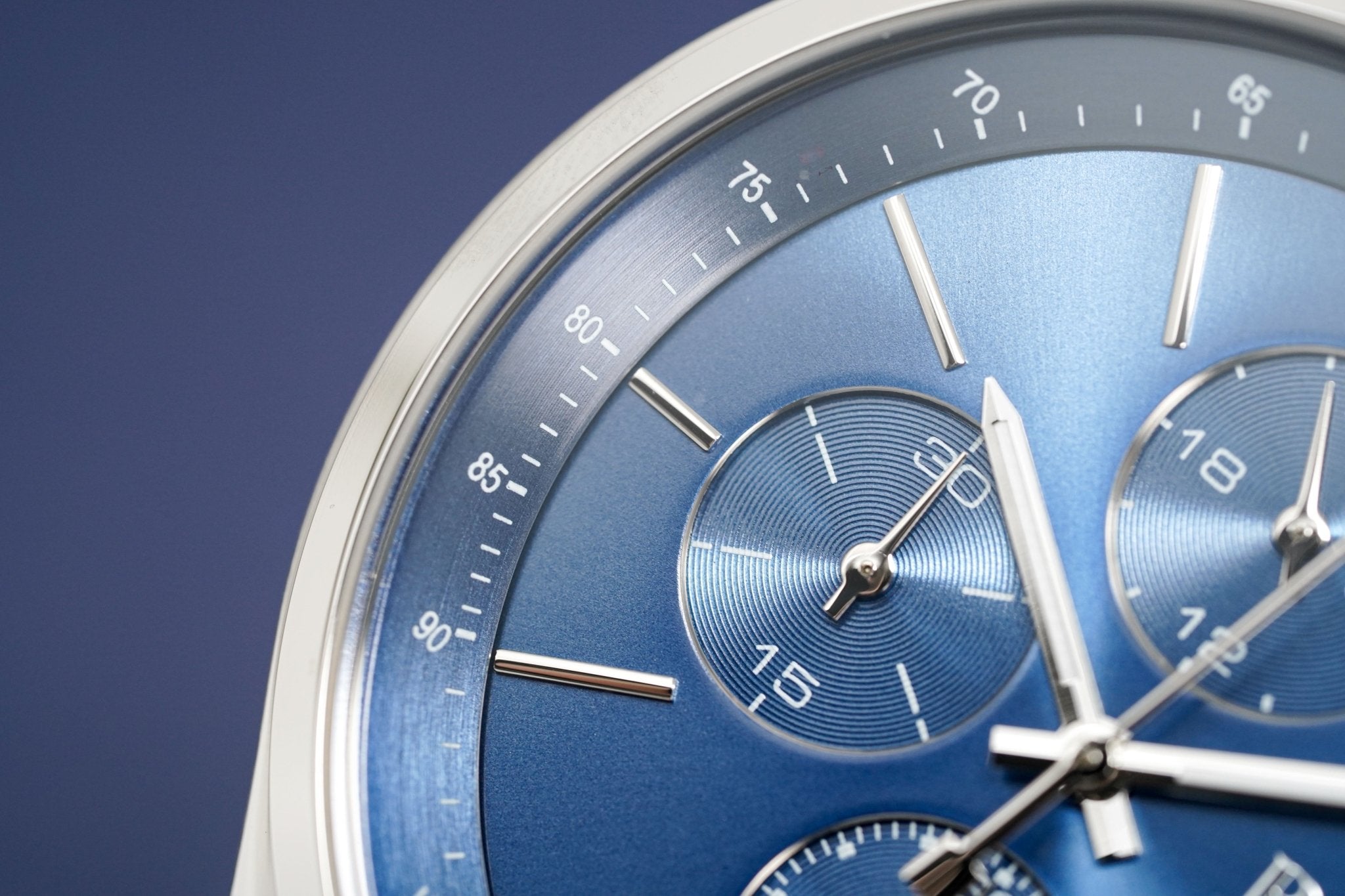 The striking blue dial, accented with silver-tone hands and indices, captures attention with its refined elegance. The chronograph functionality offers both style and practicality, allowing you to time your activities with precision. Housed in a durable stainless steel case and paired with a sleek, matching bracelet, this watch is built to withstand the demands of daily wear while maintaining a polished appearance.