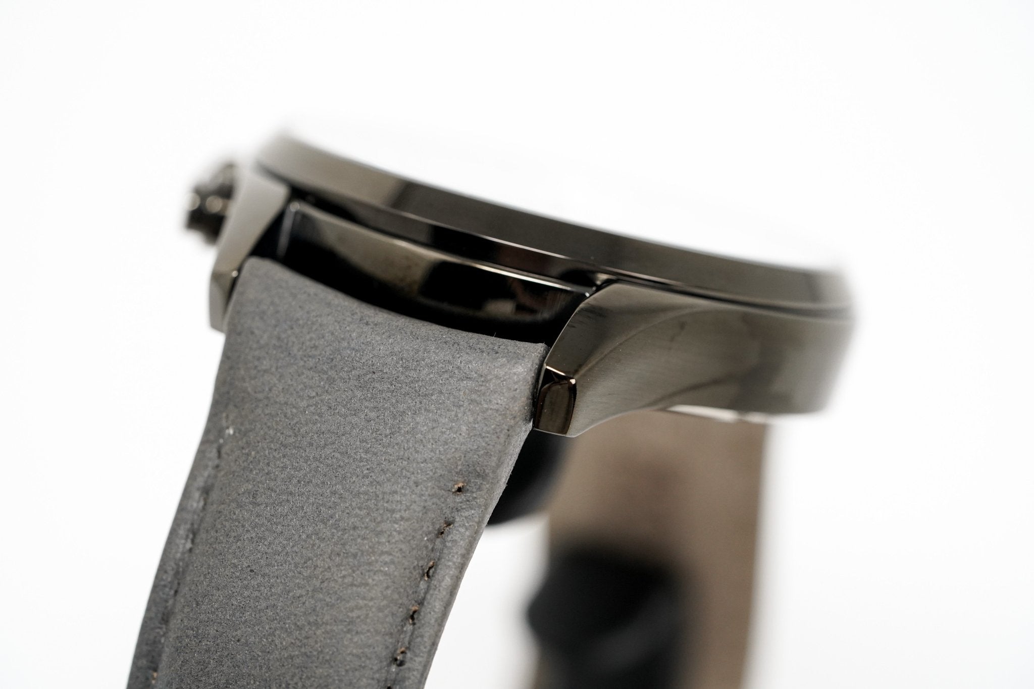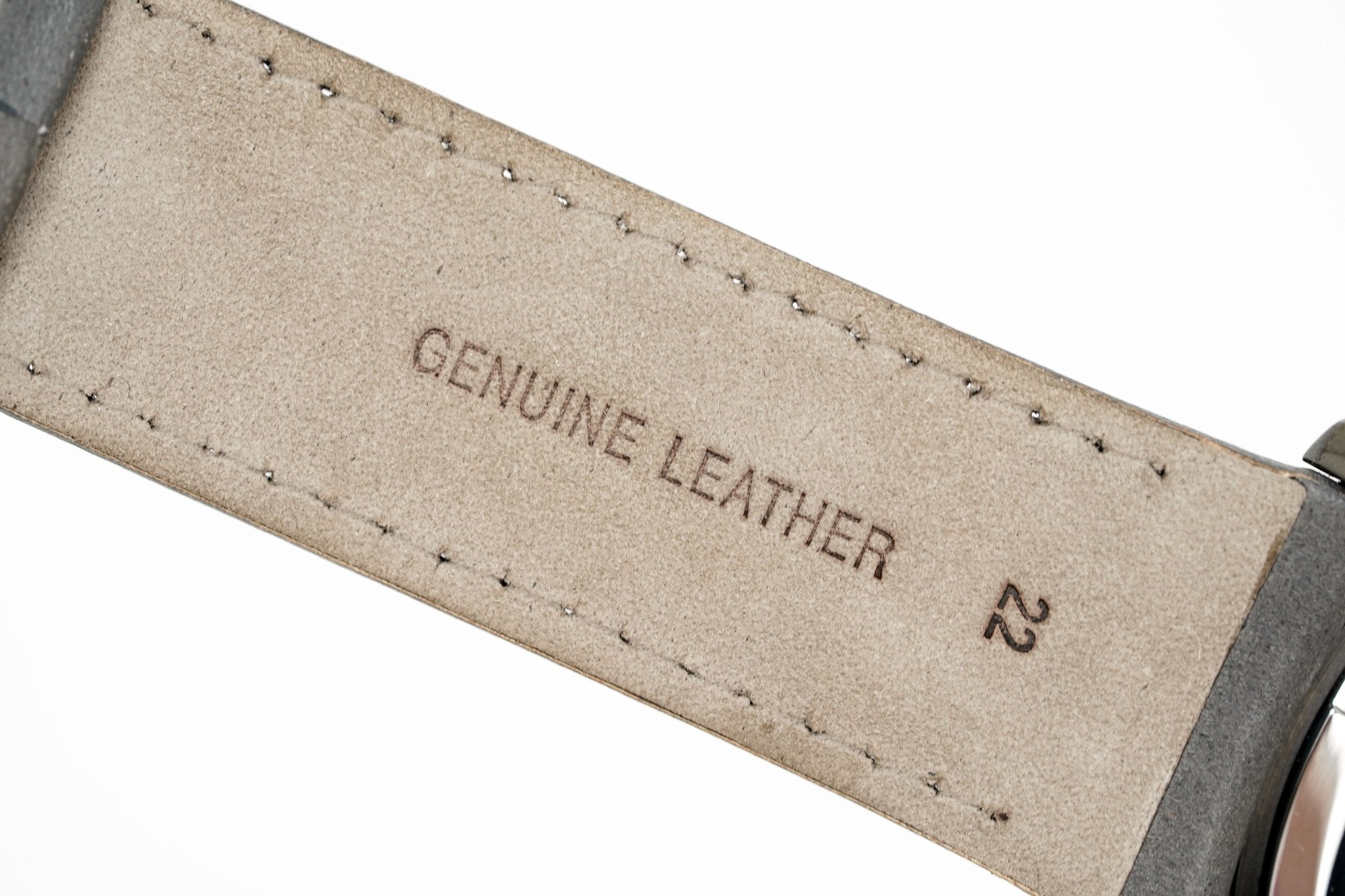 Grey Leather Strap with Stainless Steel Pin Buckle.