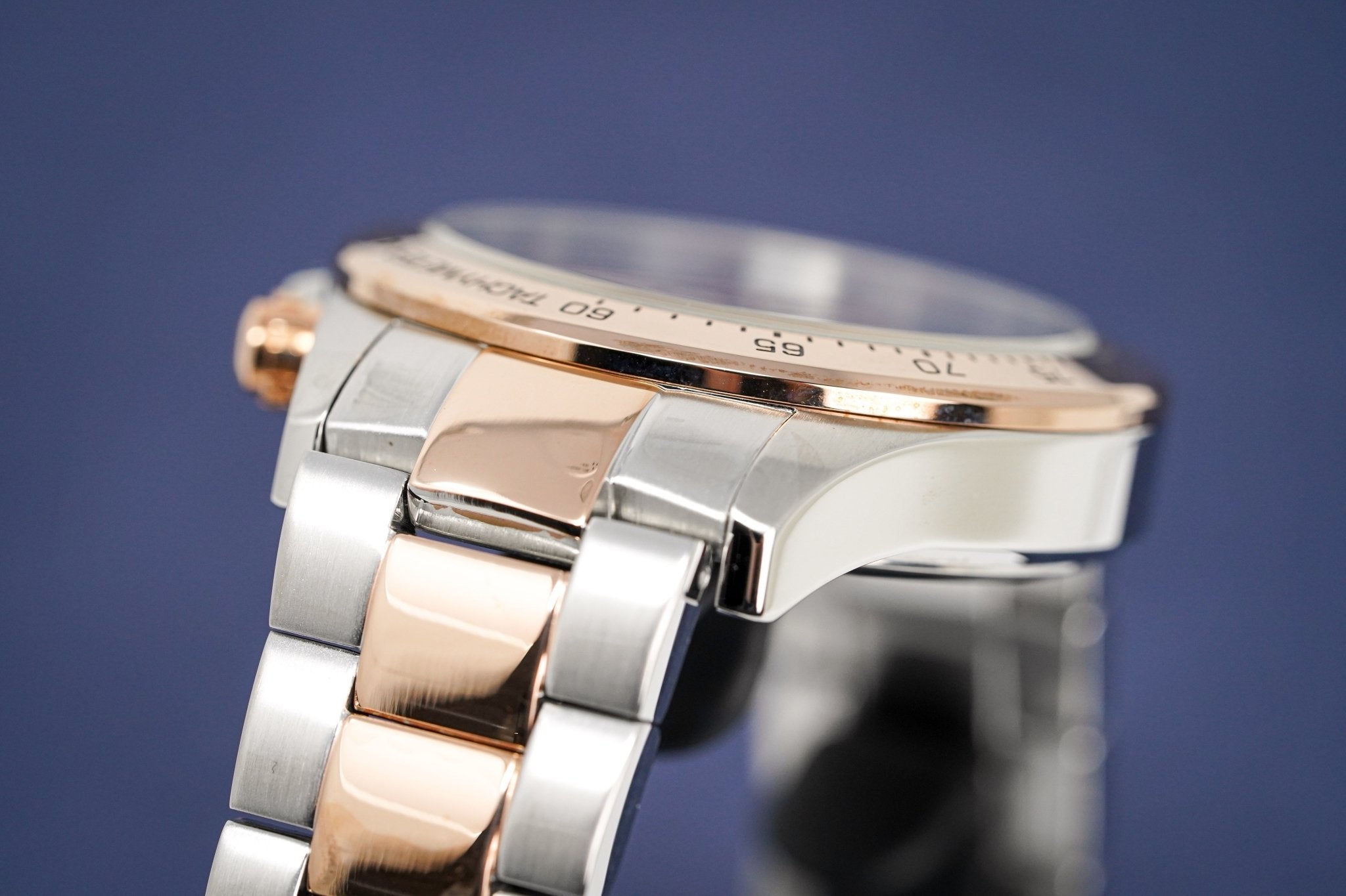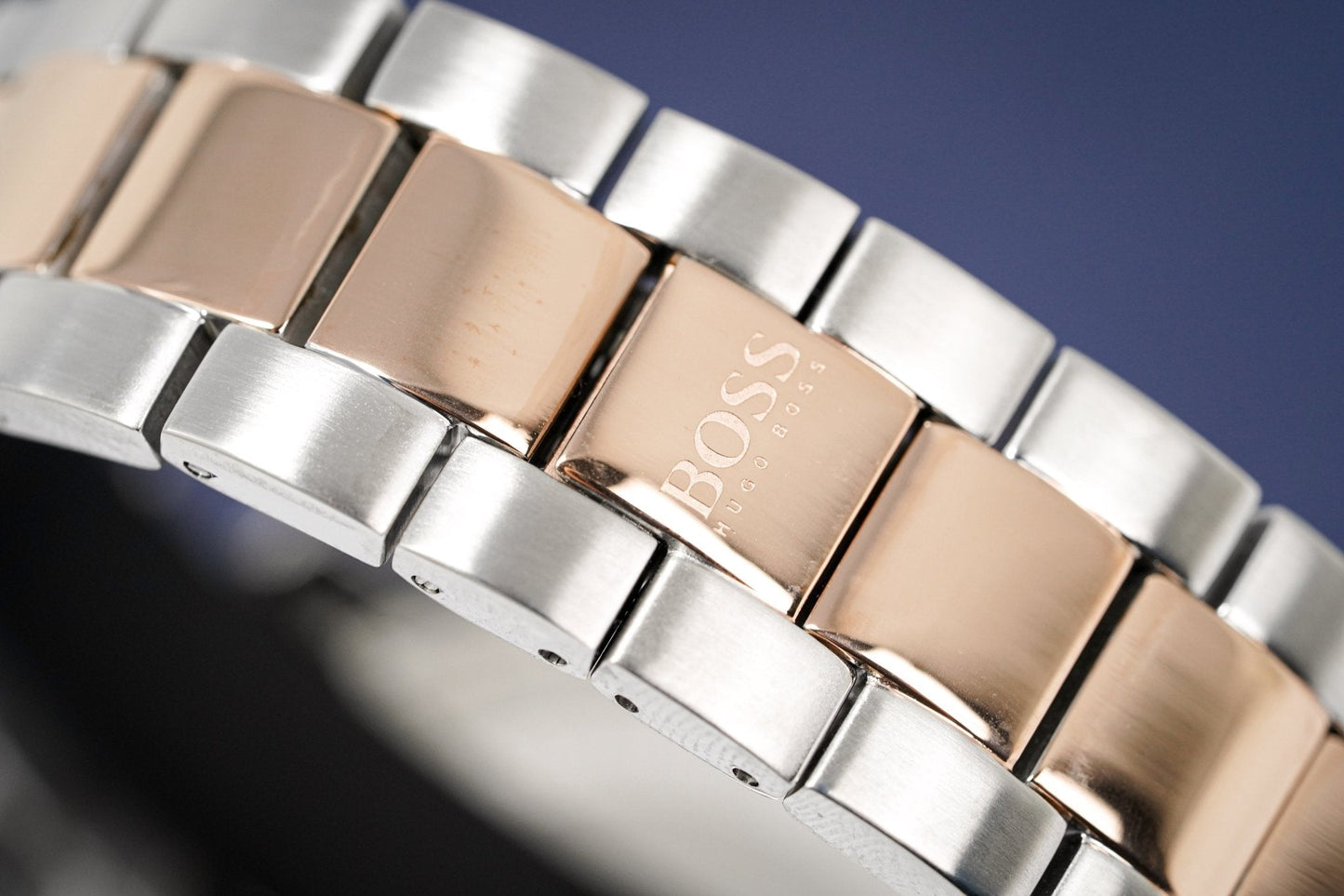 Two Tone Rose Gold PVD Plated/Stainless Steel Bracelet with Push Button Deployment Clasp.