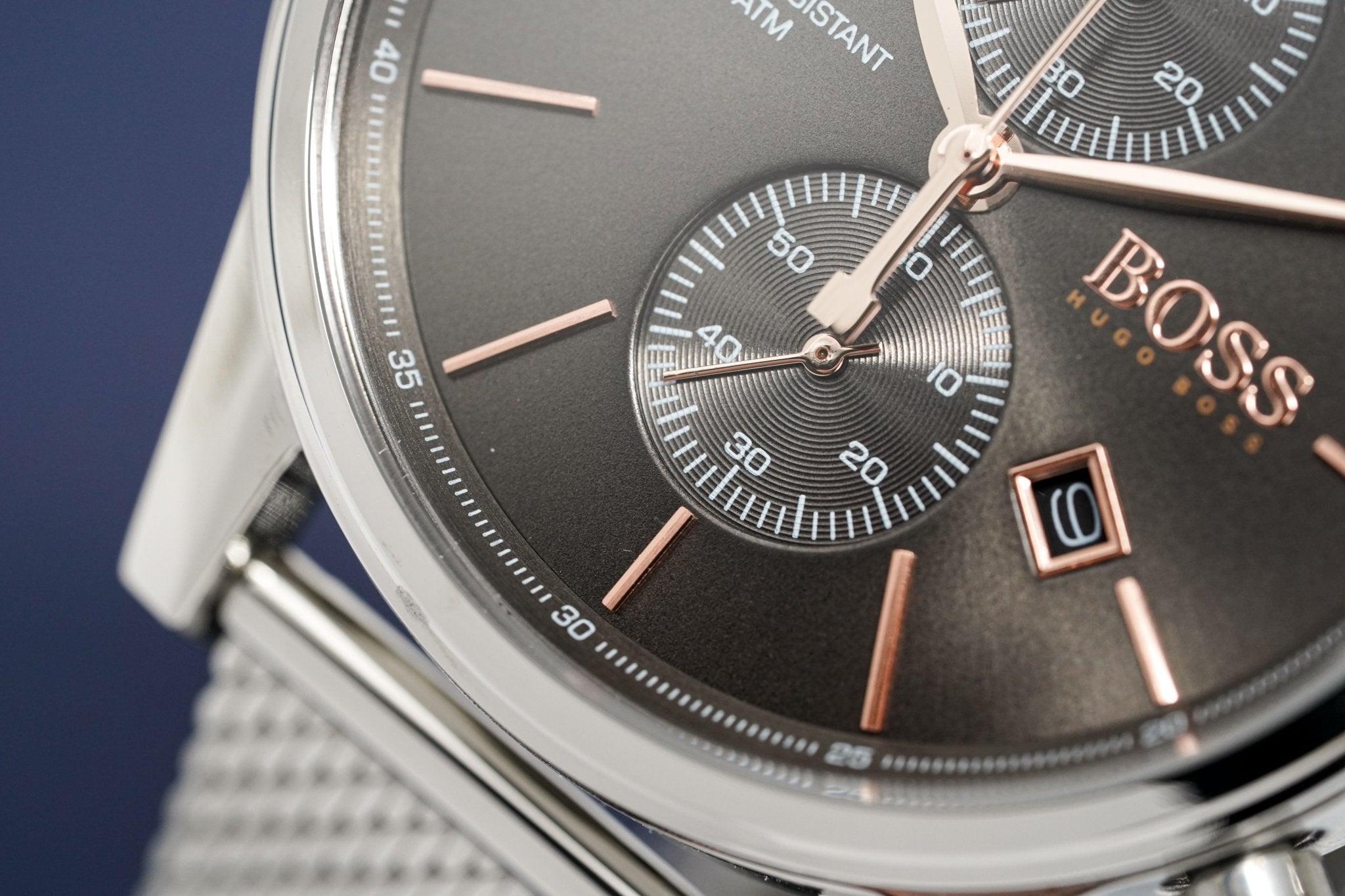 Grey Sunburst Dial. Rose Gold PVD Plated Steel Hands. Rose Gold PVD Plated Stainless Steel Stick Indexes. Date Window at 4.