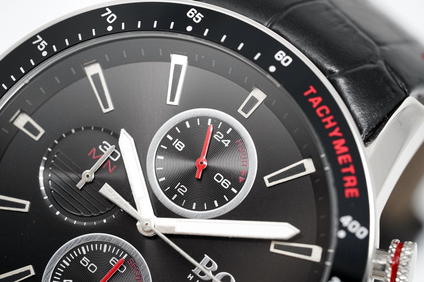 44mm Stainless Steel Case. Scratch Resistant Mineral Crystal. Tachymeter Bezel.