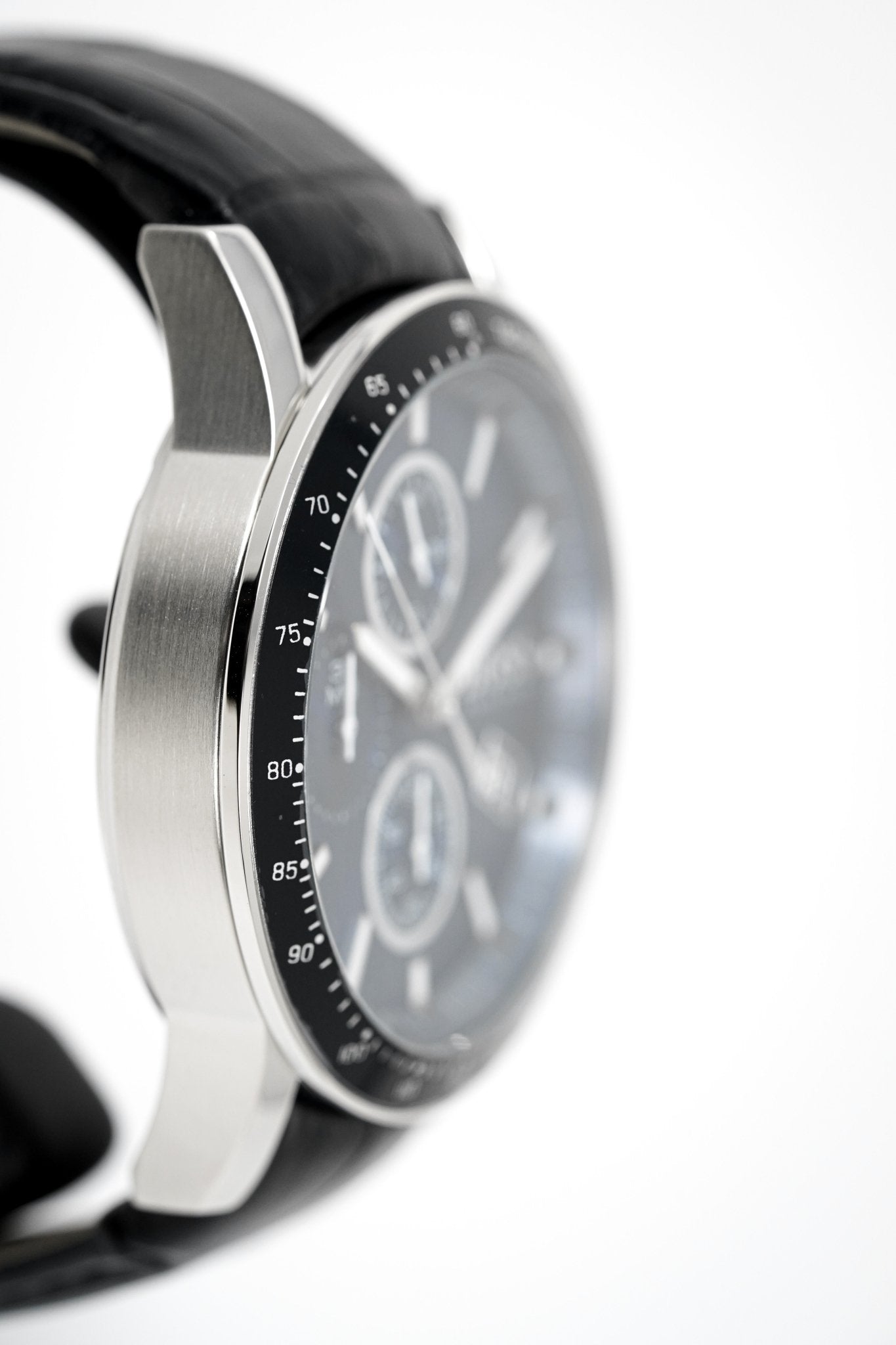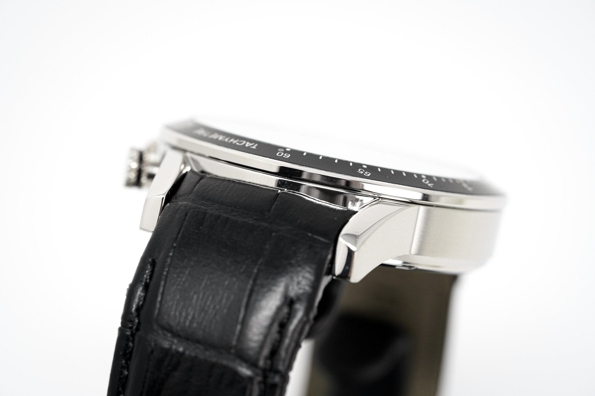 44mm Stainless Steel Case. Scratch Resistant Mineral Crystal. Tachymeter Bezel.