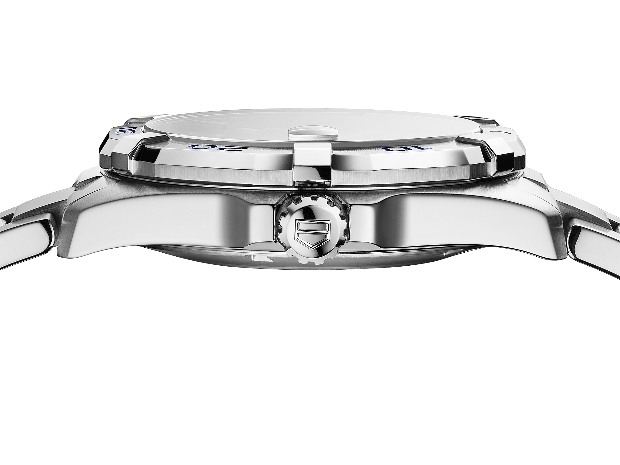 Powered by the TAG Heuer Calibre 5 self-winding automatic movement which boasts a 38 hour power reserve, beats at 28,800 vph and contains 25 to 26 rubies depending on the execution. The dial is protected by a flat scratch-resistant sapphire crystal with anti-reflective treatment. The case is round and 41 mm in diameter. Inlet width: 20 mm. Screw-down crown and case back. Stainless steel folding clasp with diving extension. Water-Resistant to 300 meters / 1000 feet. Functions: hours, minutes, seconds, date. Diving watch style. Swiss Made.