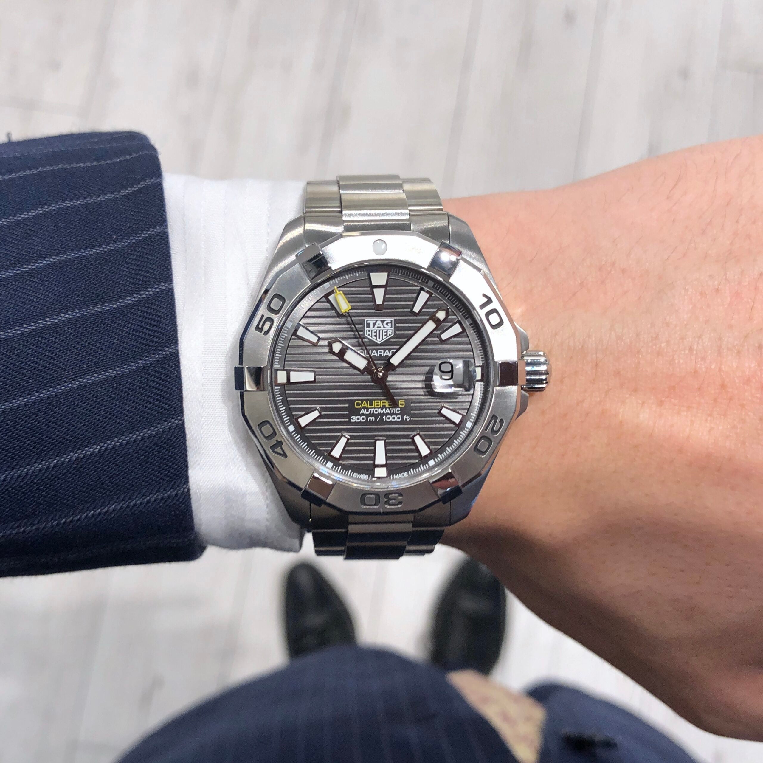 Crafted for the modern man, the Tag Heuer Aquaracer Calibre 5 watch boasts a sleek silver steel strap and a striking grey dial. With precision and style, this watch is perfect for any occasion. Expertly designed with Tag Heuer's Calibre 5 technology, this watch is a must-have for any timepiece enthusiast.