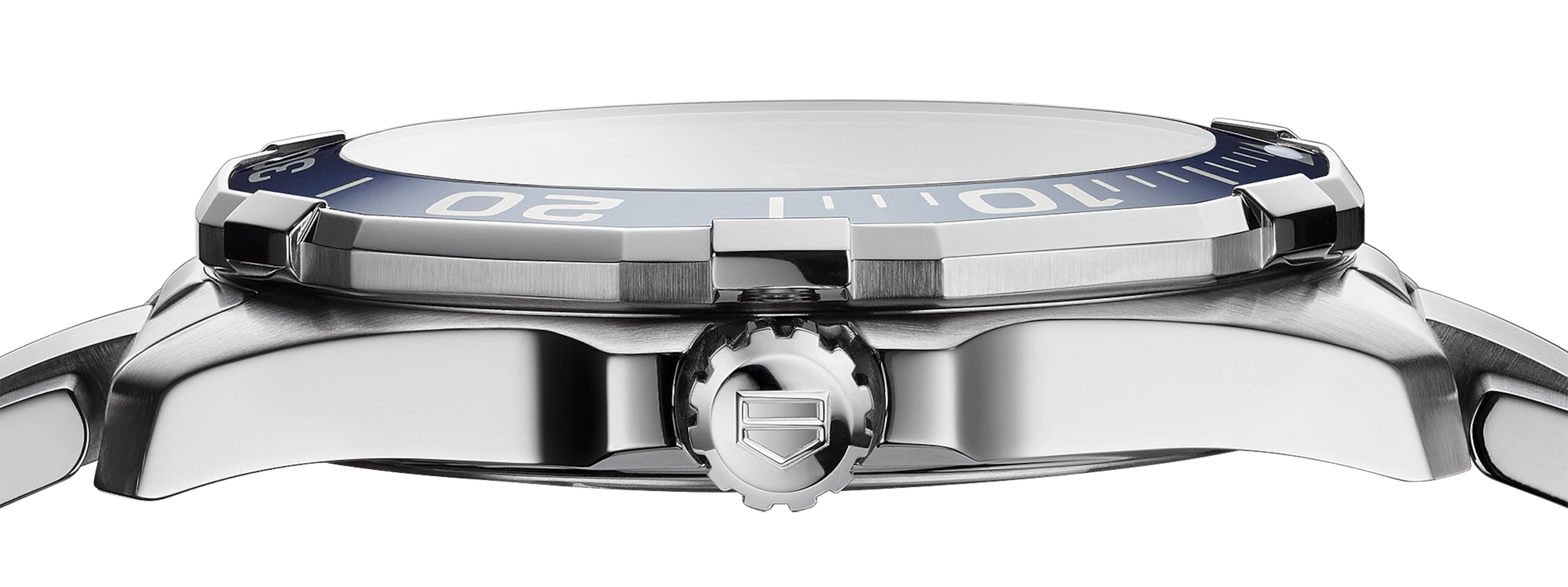An extremely robust professional dive watch with a 43mm steel case and a Swiss-Made quartz movement. The eye-catching blue of the dial and 60-minute scale unidirectional turning bezel and flange is an Aquaracer signature, as is... the orange on the central hand. Water resistance: 300 meters.