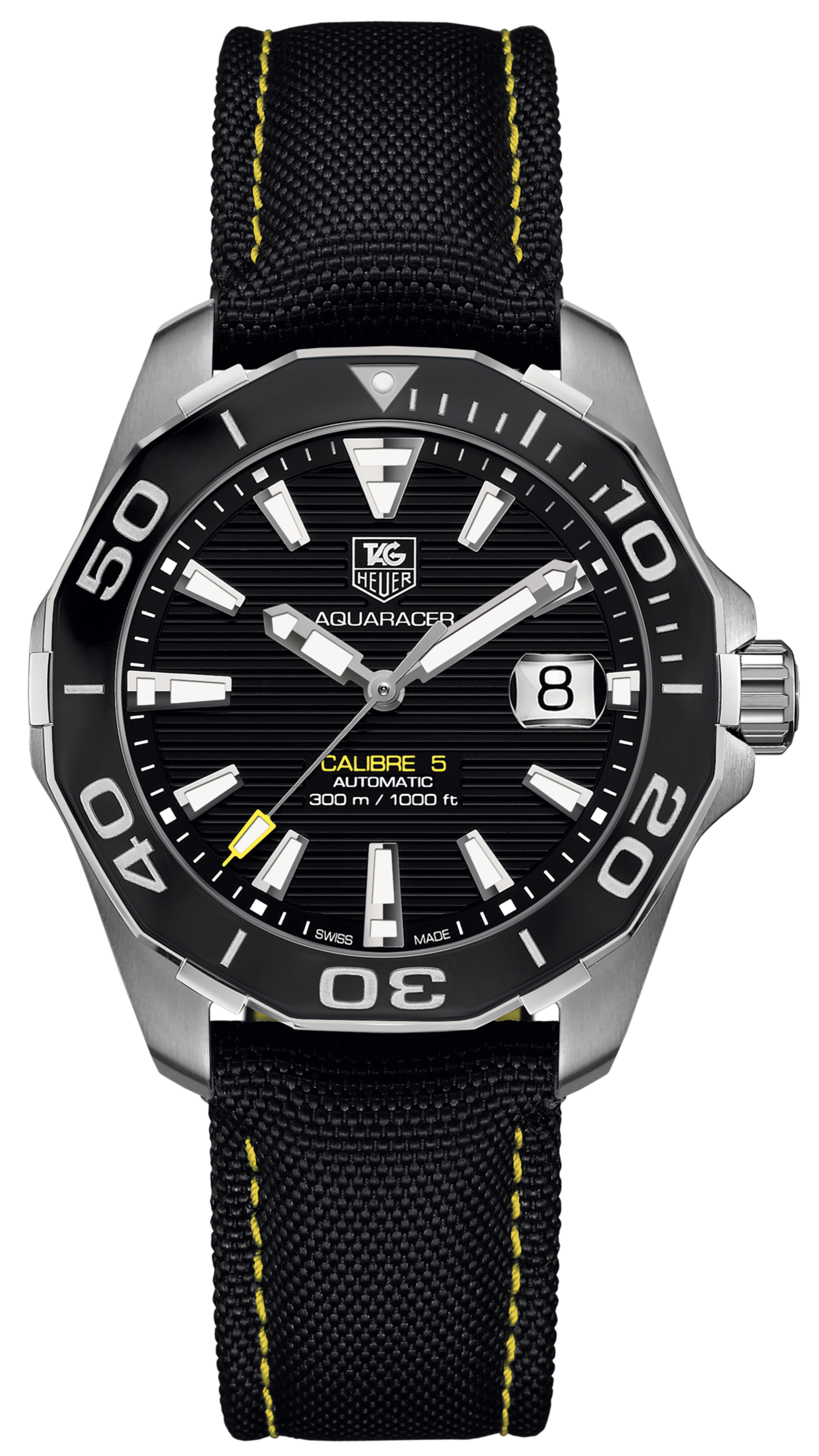 Expertly crafted for the modern man, the Tag Heuer Aquaracer Calibre 5 watch features a sleek black dial and sturdy nylon strap. Boasting automatic movement and water resistance up to 300 meters, this timepiece combines style and function for the ultimate accessory. Elevate your look with precision and sophistication.