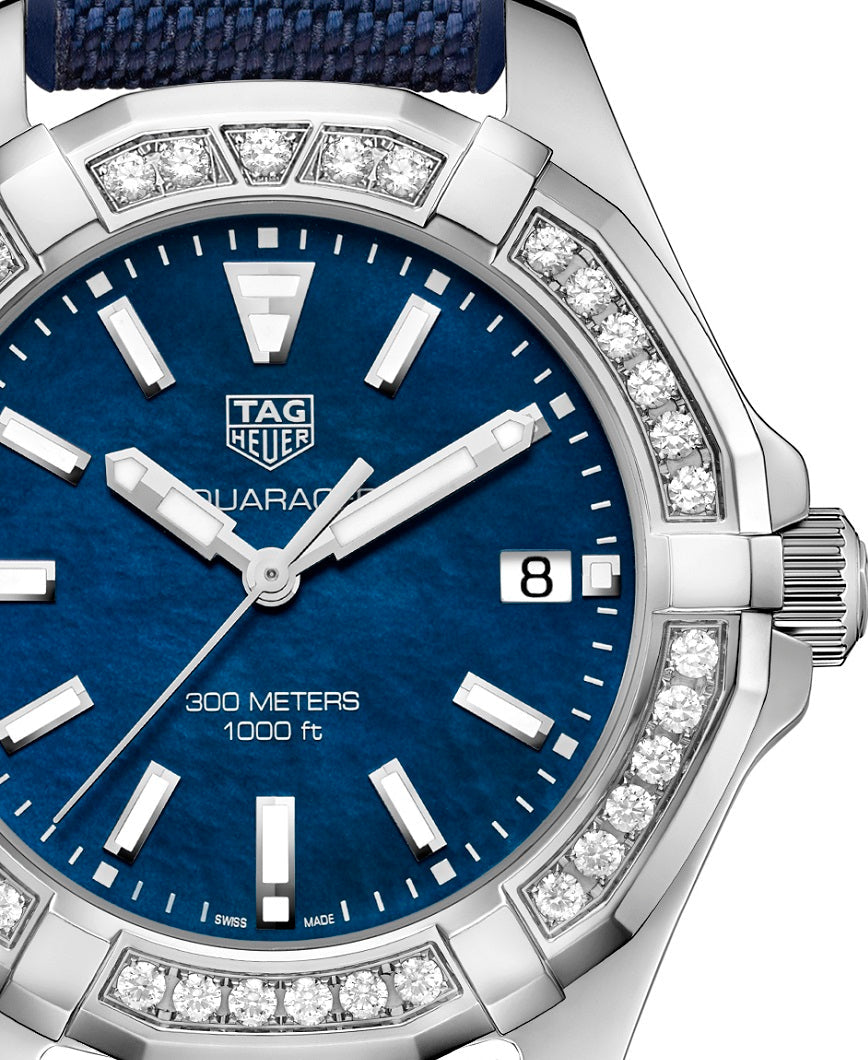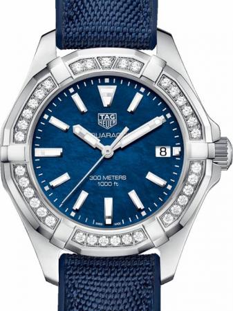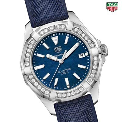 TAG Heuer Aquaracer Quartz 35 mm watch. Model reference: WAY131N.FT6091. Stainless steel case set with diamonds. Blue mother-of-pearl dial. Quartz movement. Blue fabric strap with rubber inner lining. Swiss made. The watch comes in the original packaging, with a set of documents and 2 years warranty.Brand | Tag Heuer |