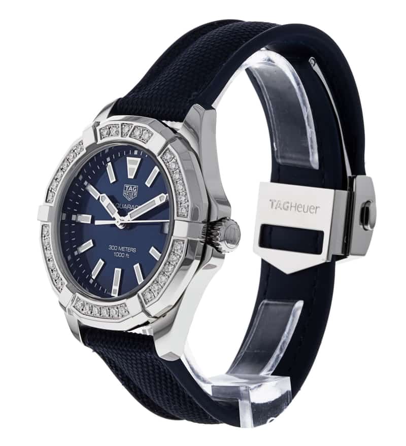 Experience luxury with the Tag Heuer Aquaracer Quartz Diamonds Blue Dial Blue Nylon Strap Watch for Women. Featuring a blue dial and diamond accents, this watch exudes elegance and style. The high-quality quartz movement ensures precise timekeeping, while the durable nylon strap provides comfort and durability. Elevate your look with this stunning timepiece.