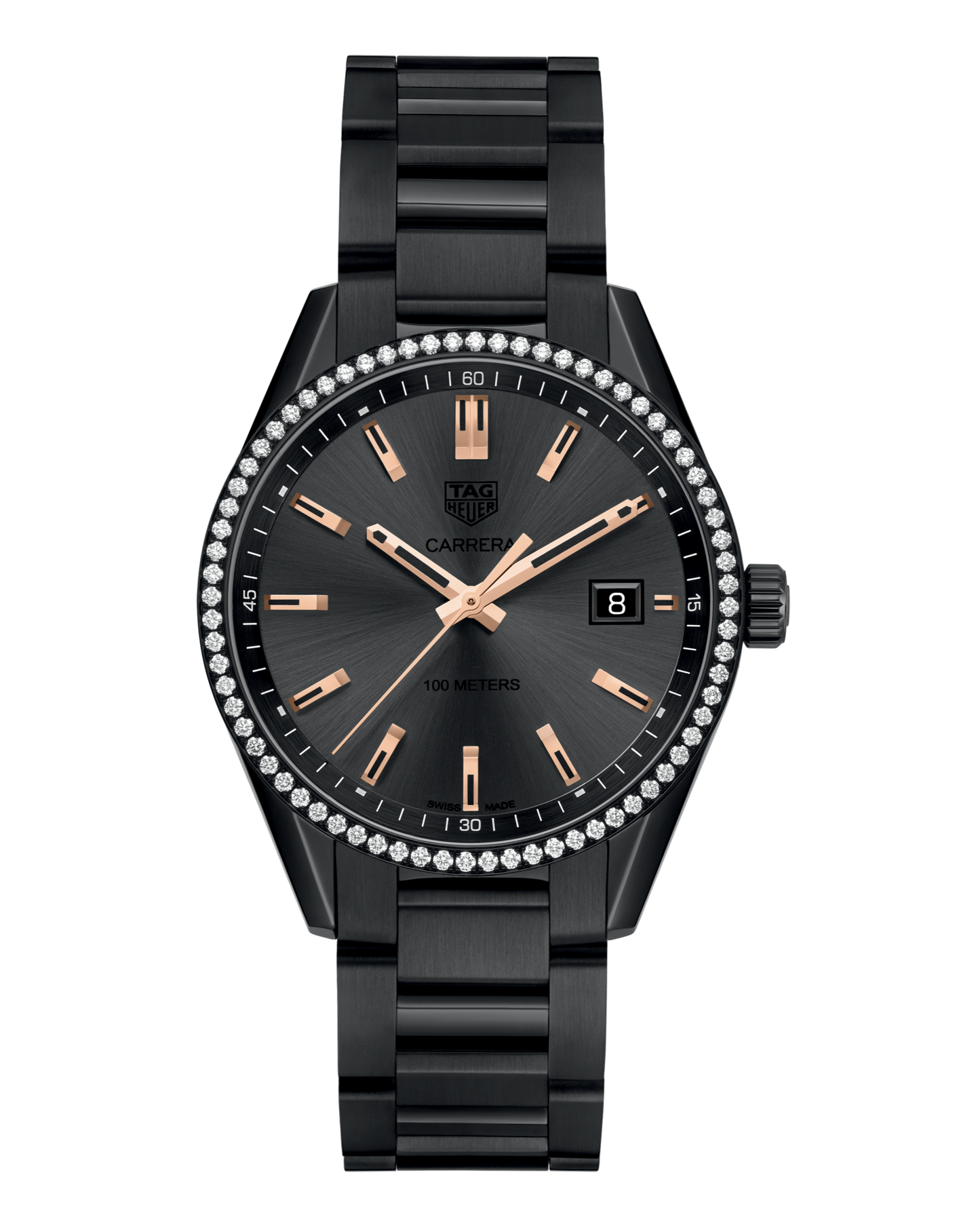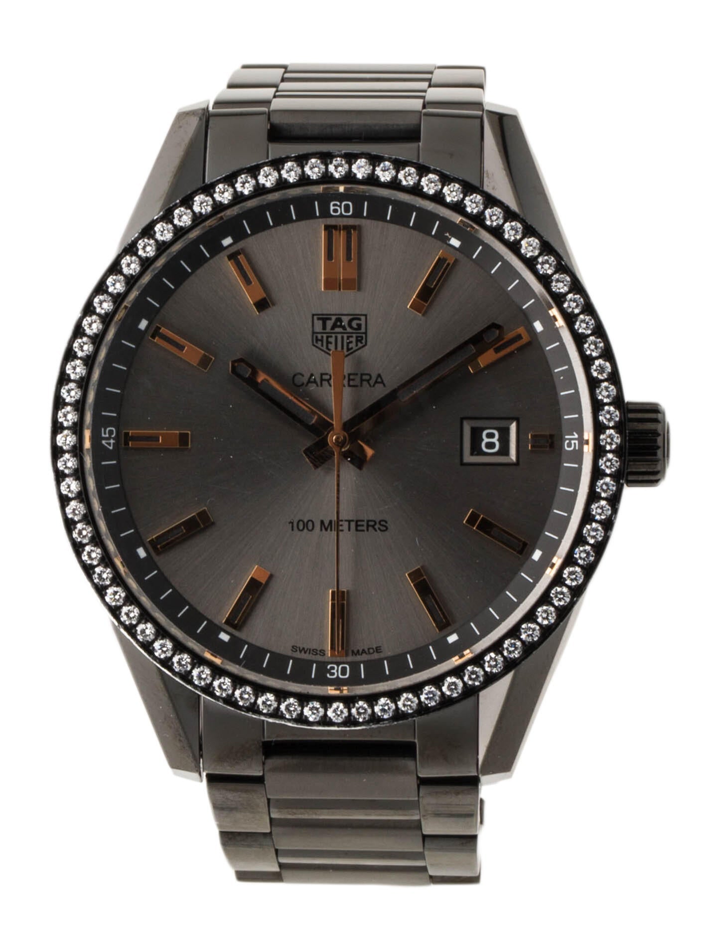 Black titanium case with a black titanium bracelet. Fixed- set with 72 wesselton diamonds black aluminum bezel. Anthracite dial with rose gold-tone hands and index hour markers. Minute markers around the outer rim. Dial Type: Analog. Date display at the 3 o'clock position. Quartz movement. Scratch resistant sapphire crystal. Case size: 39 mm. Round case shape. Water resistant at 100 meters / 330 feet. Functions: date, hour, minute, second. Watch label: Swiss Made. Tag Heuer Carrera Anthracite Dial Ladies Titanium Diamond Watch WAR1115.BA0602.