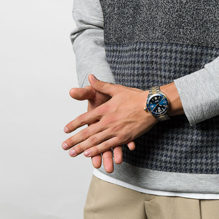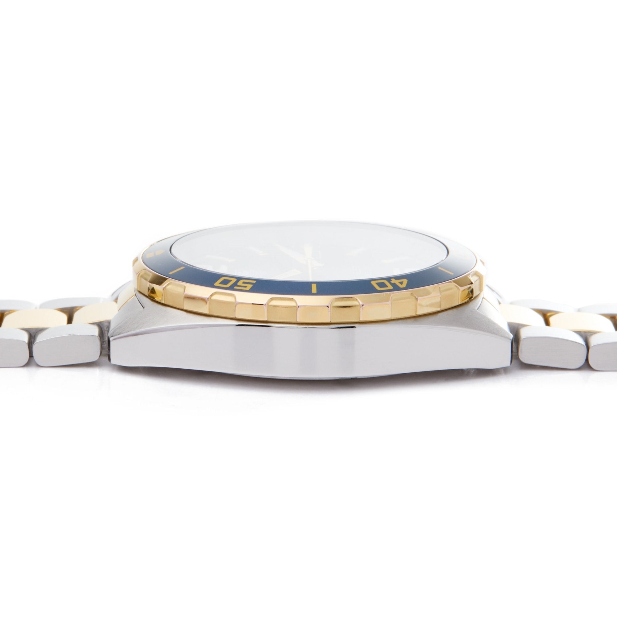 Stainless steel case with a two-tone (silver-tone and yellow gold-plated) stainless steel bracelet. Unidirectional rotating yellow gold-plated stainless steel with a blue top ring bezel. Navy blue dial with luminous yellow gold-tone hands and index hour markers. Arabic numerals mark the 6 and 12 o’clock positions. minute markers around the outer rim. Dial Type: Analog. Luminescent hands and markers.