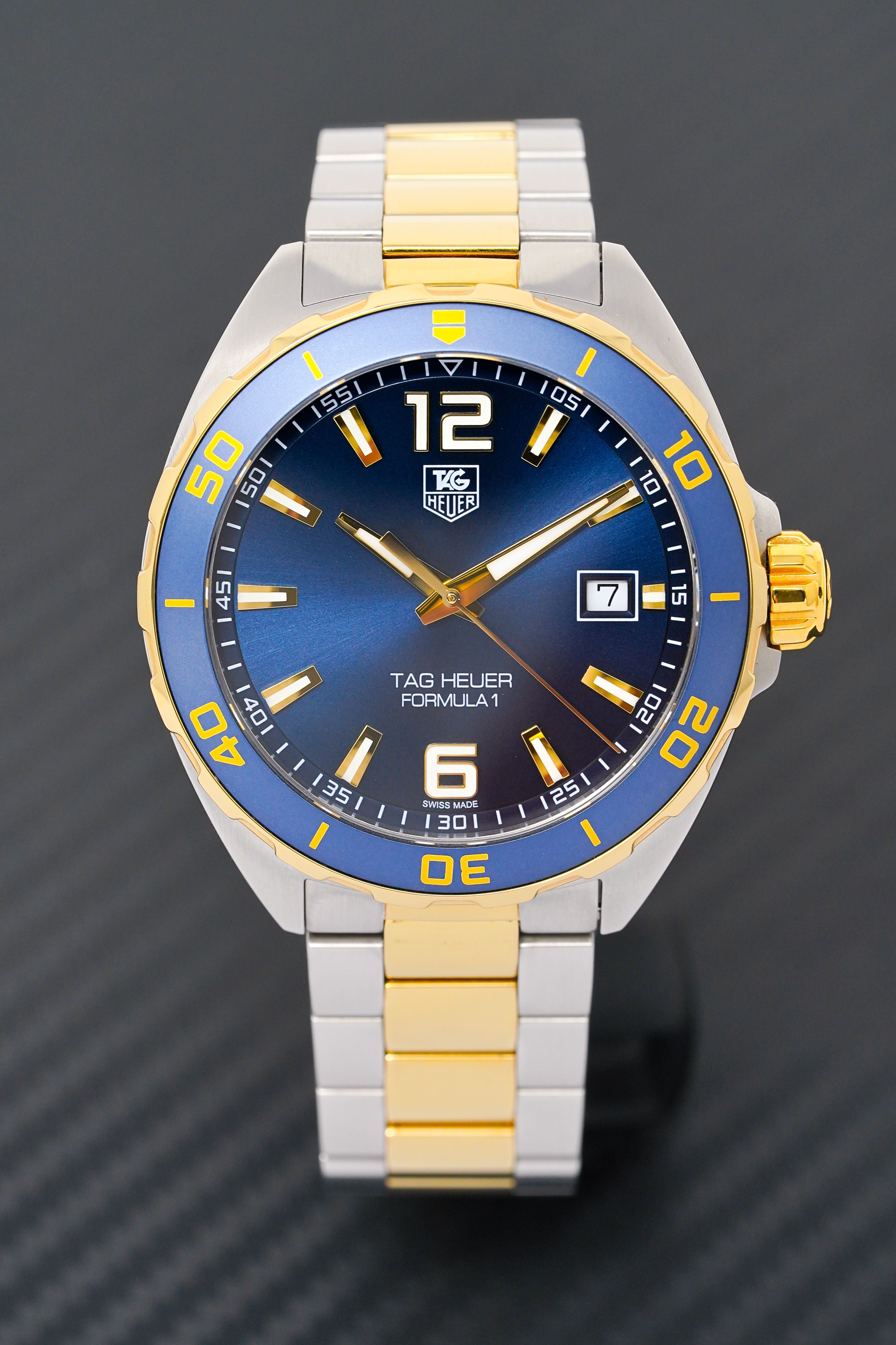 Date display at the 3 o’clock position. Quartz movement. Scratch resistant sapphire crystal. Screw down crown. Solid case back. Round case shape, case size: 41 mm, case thickness: 11 mm. Band width: 20 mm, band length: 8 inches. Deployment clasp. Water resistant at 200 meters / 660 feet. Functions: date, hour, minute, second. Luxury watch style. Watch label: Swiss Made. Item Variations: WAZ1120 BB0879, WAZ1120-BB0879, WAZ1120/BB0879, WAZ1120BB0879. Tag Heuer Formula 1 Navy Blue Dial Two-tone Men’s Watch WAZ1120.BB0879.
