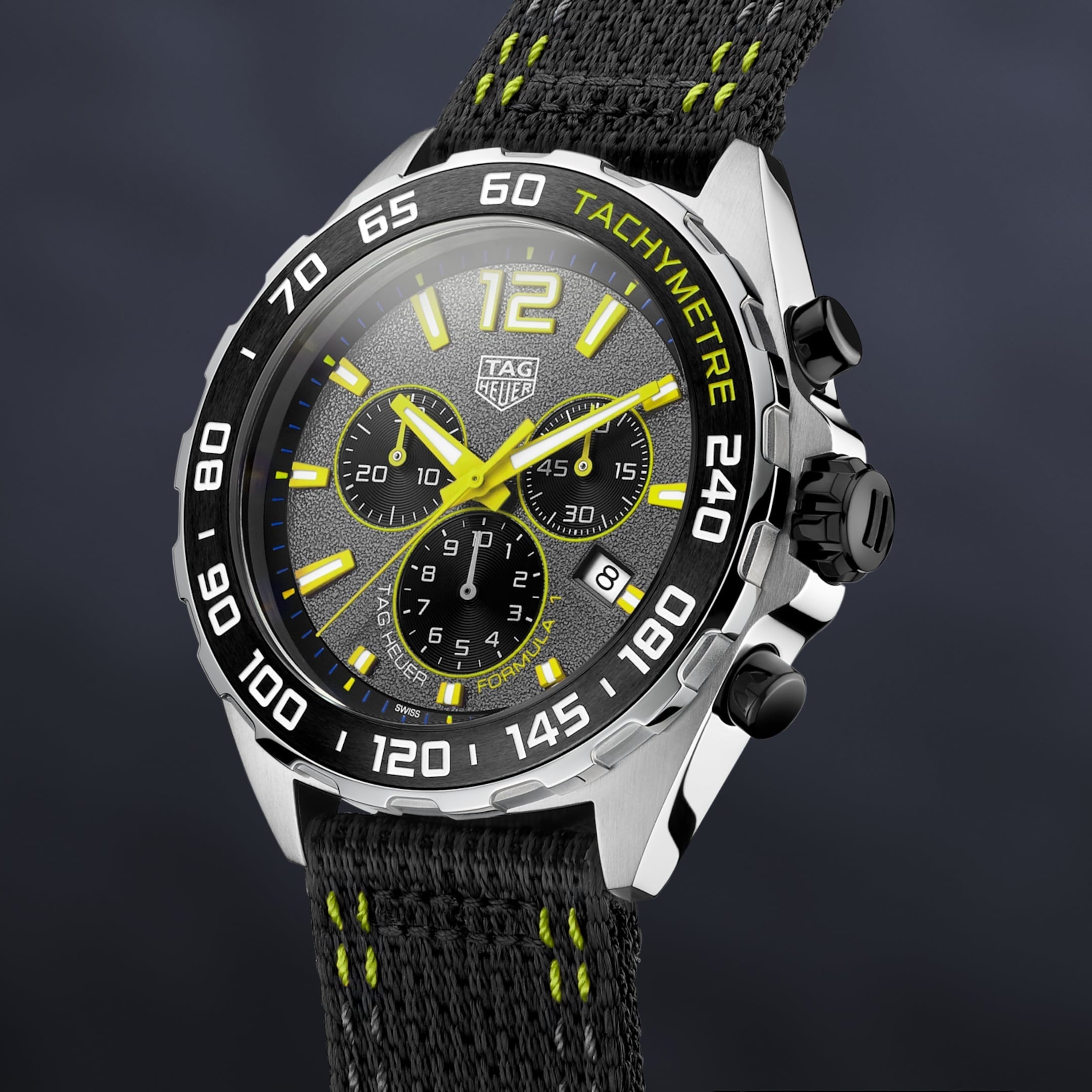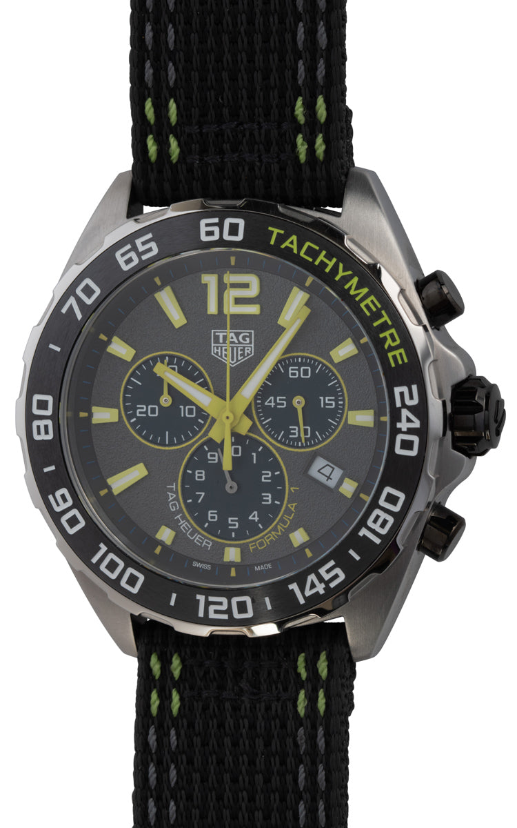 Matching the dial and bezel a high quality textile strap with eye-catching lime yellow accents, secured by a pin buckle for comfort on the race track.