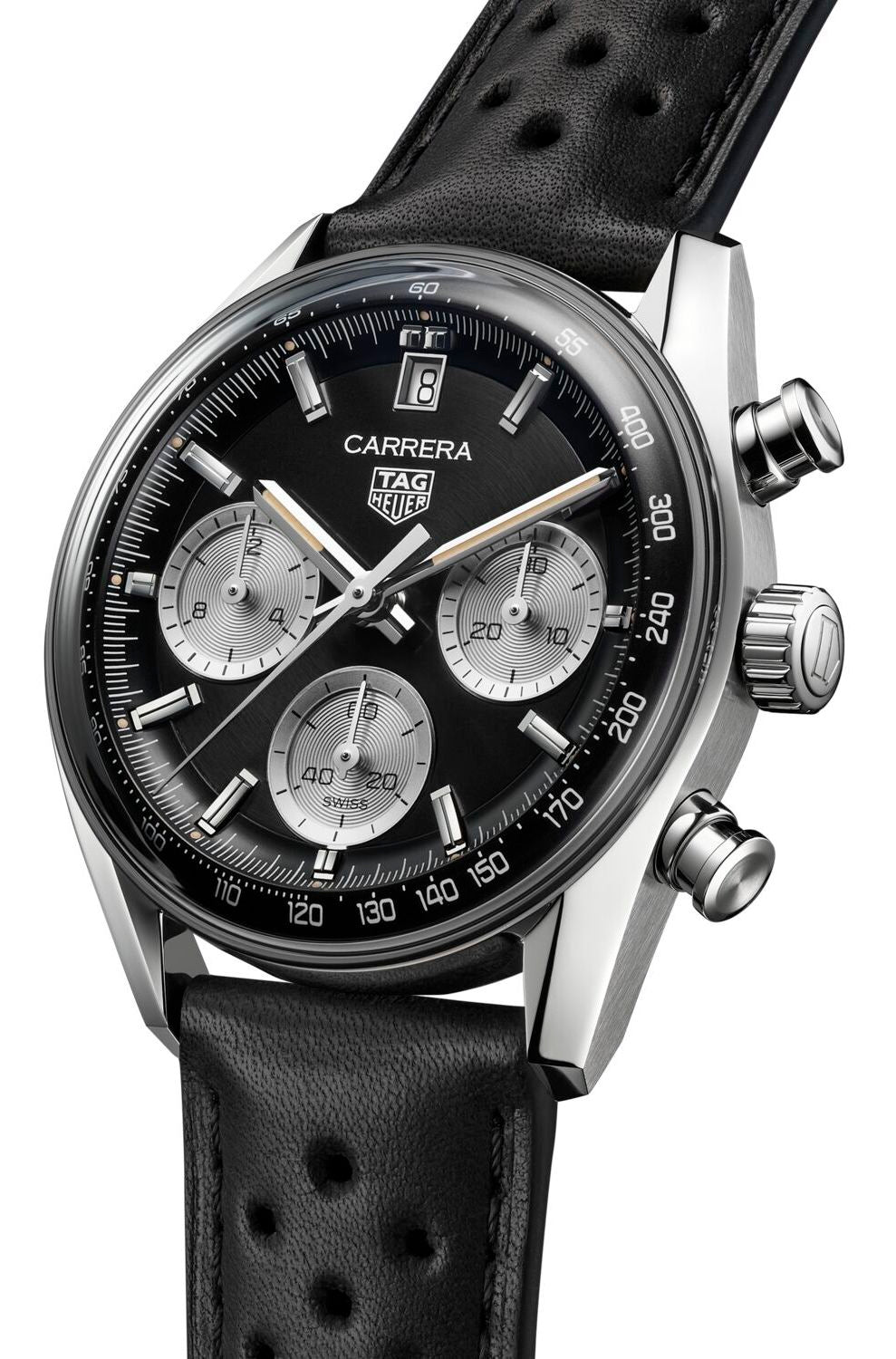 The TAG Heuer Carrera Chronograph watch reference CBS2210.FC6534 features a strong piece of sapphire crystal glass on the top of the case, promising ample protection over the dial. The reverse of the case also features this same material, offering a view into the in-house Calibre TH20 00 automatic movement as it performs effortlessly. Additional features of this men’s Tag Heuer Carrera watch include a black filled tachymeter scale on the bezel and a matching black perforated leather strap with a stainless steel folding clasp to finish.