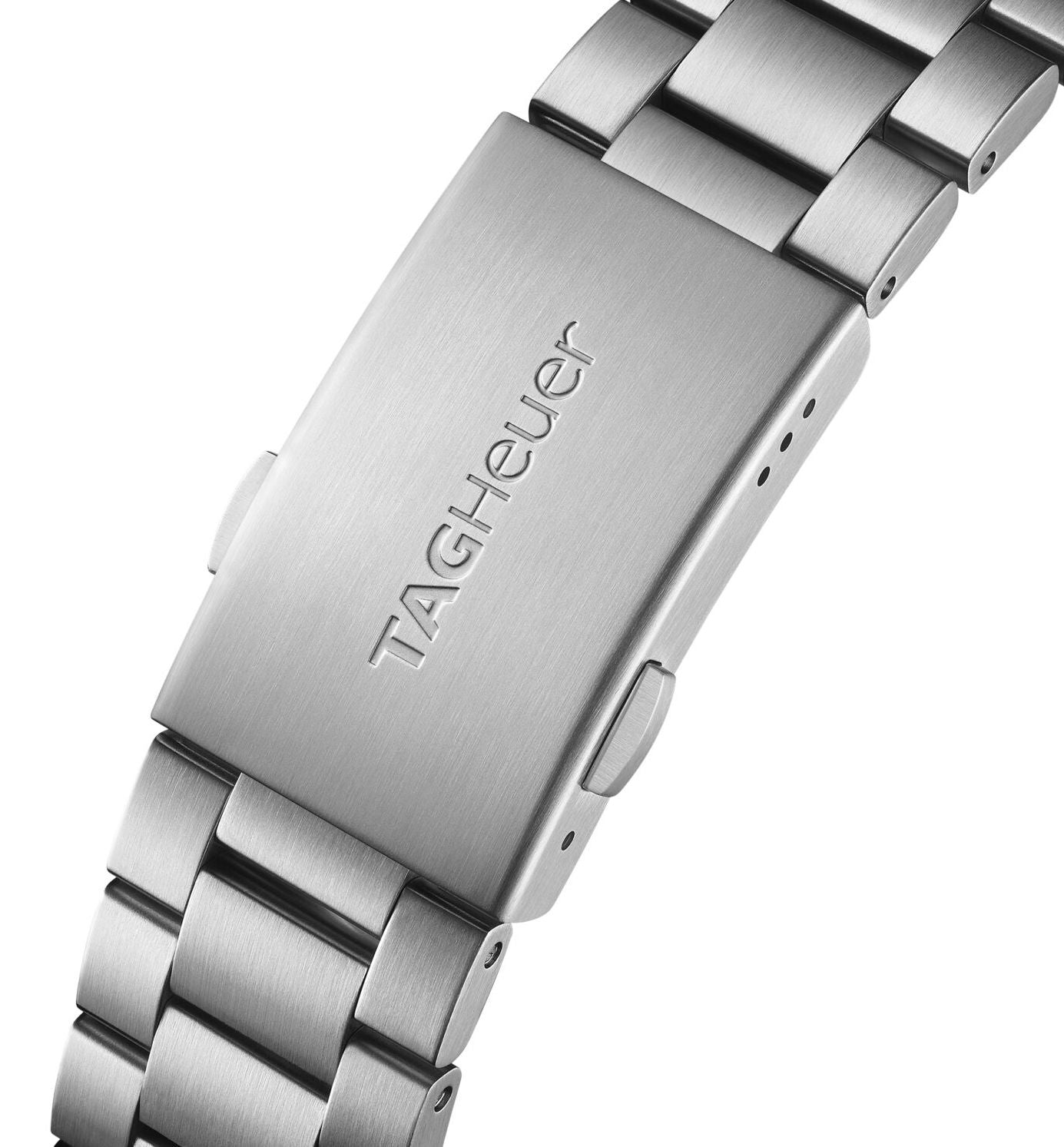 Sporting the bright orange and blue livery of Gulf, TAG Heuer’s legendary partnership with the company is reinterpreted in this bold and adventurous Formula 1 watch. Orange and white vertical stripes adorn the sunray blue dial of this TAG Heuer Formula 1 X Gulf Special Edition watch reference CAZ101AT.BA0842, combined with orange and white accents on the chronograph 30 minute counter at 9 o’clock and the one tenth of a second feature at 6 o’clock. The 43mm stainless steel model is characterised by large and bold luminous coated central hands and Arabic numeral hour markers that exude a sporty persona, as does the useful tachymeter scale around the bezel. This men’s TAG Heuer Formula 1 x Gulf watch features a white date window nestled between the 4 and 5 o’clock location and boasts a vibrant orange central chronograph seconds hand.