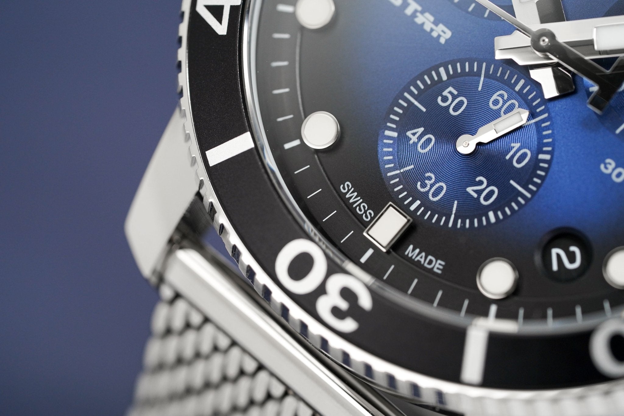 Blue/Black Graded Dial with Stainless Steel Luminous Hands and Indexes - Small Seconds - Date Window Between 4 and 5 O'Clock - 1/10 Seconds, 60 Seconds and 30 Minutes Sub-Dials - ADD and SPLIT Functions.