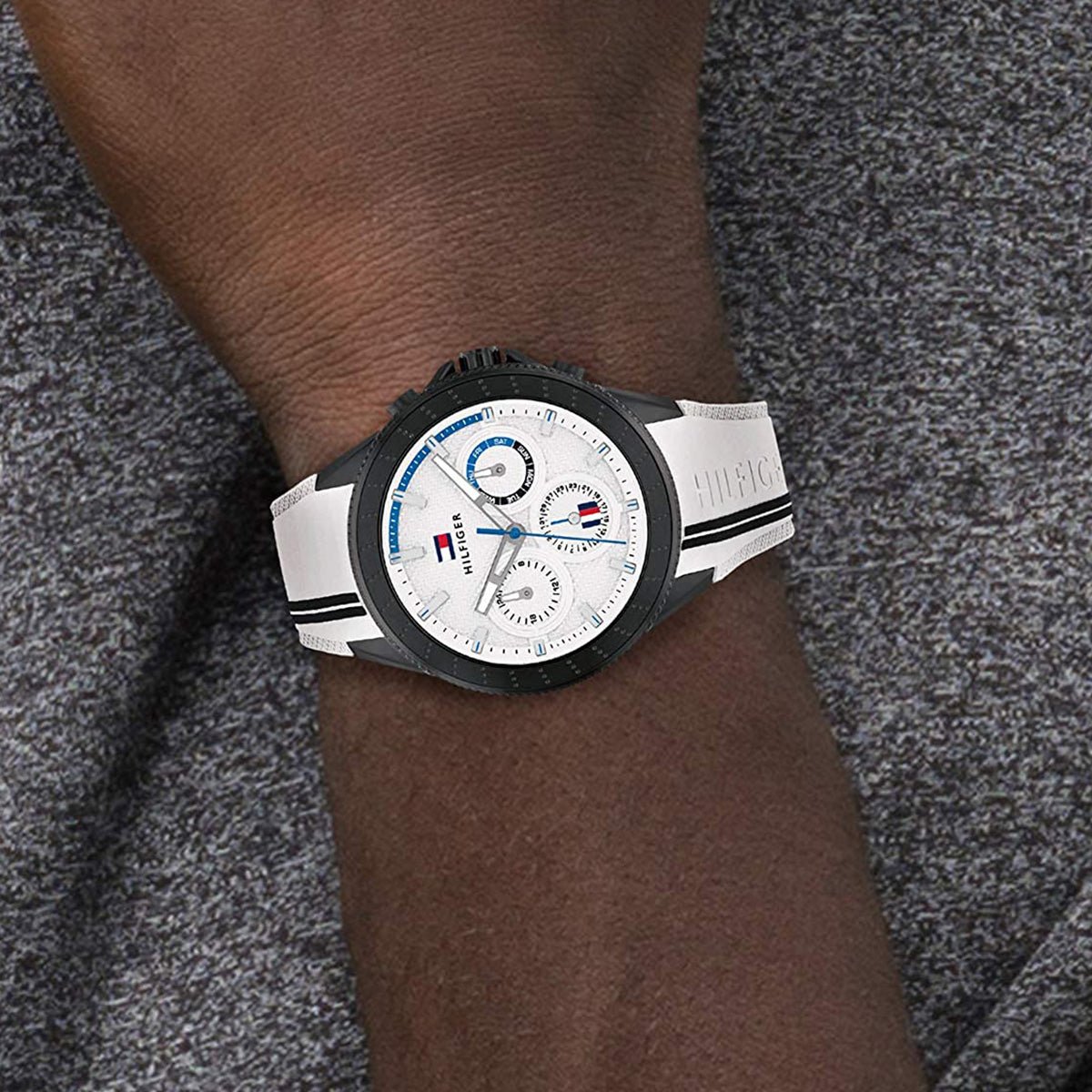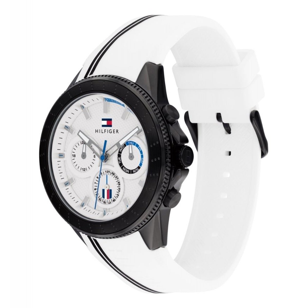 The Men's Tommy Hilfiger Watch 1791862 (1791862) is available to buy from Shade Station. It features a white silicone strap, an ip black stainless steel case and has a white with three hand movement, sub dial day/date display dial.