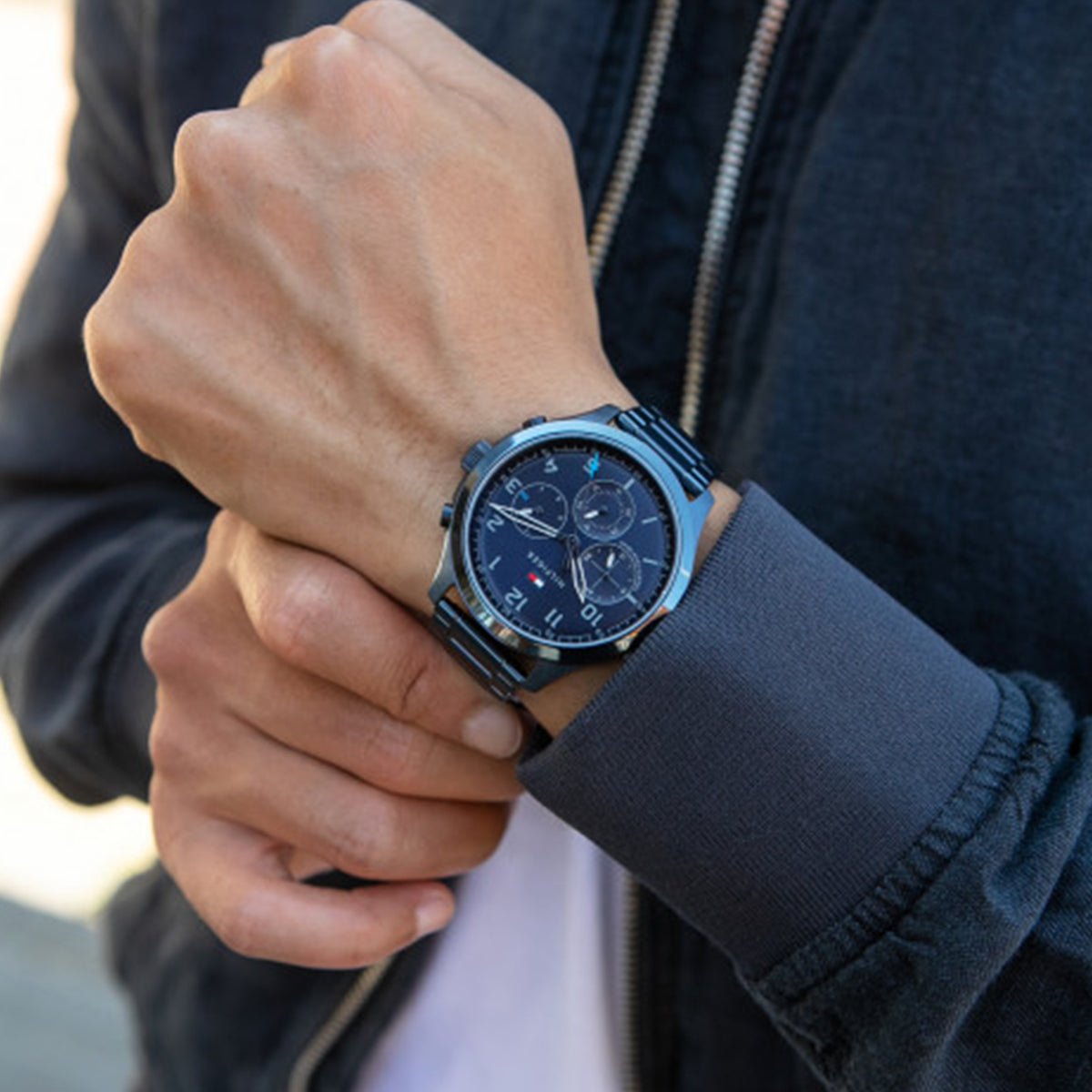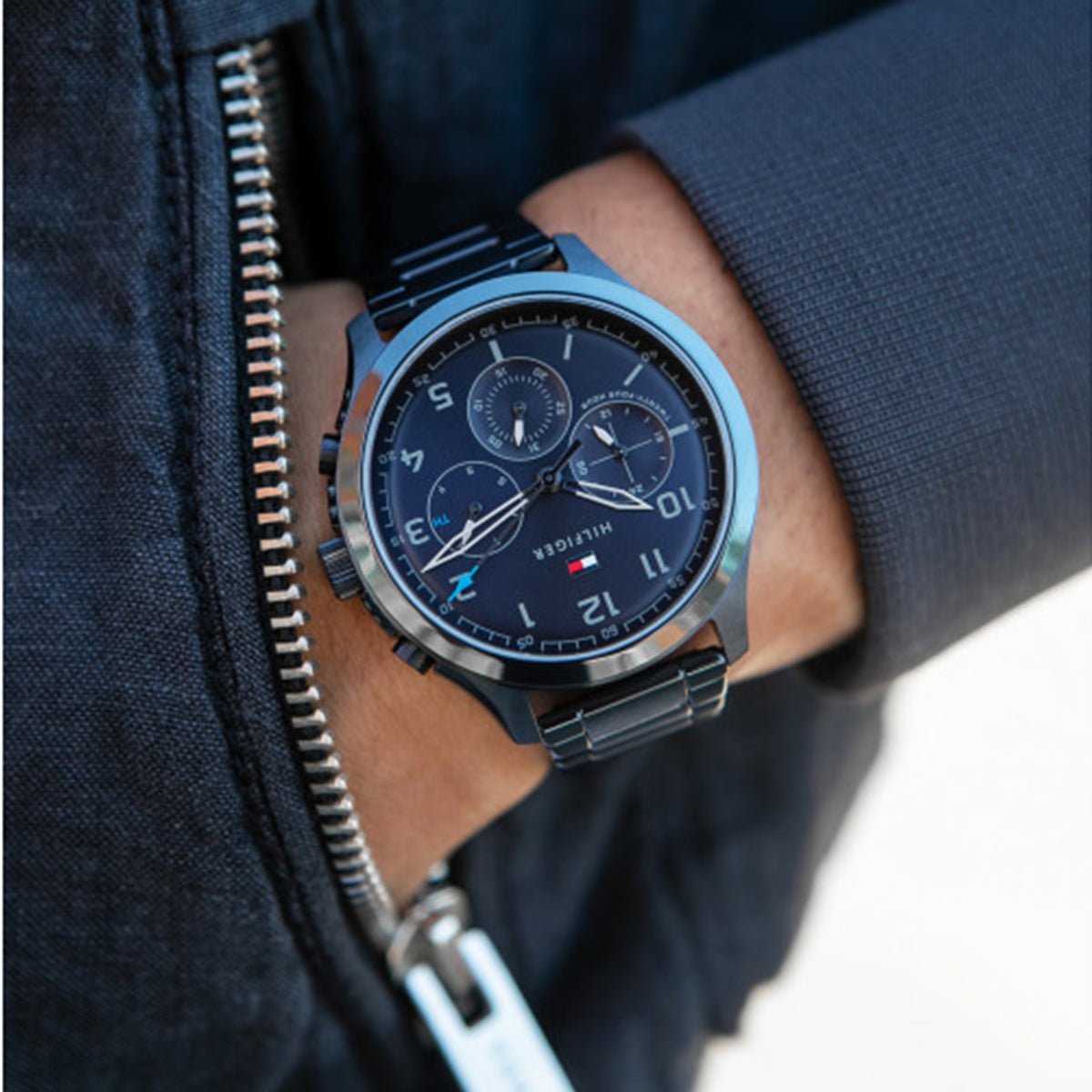 A casual but edgy take on the Iconic Tommy Style. The 44MM case is available in various finishes including stainless steel, Blue IP, Grey IP, and Black IP. The multifunction dial features dome sub-eyes with a circular brushed texture. Attached to a bracelet, mesh, or leather straps. 5 ATM/ 50 Meters.