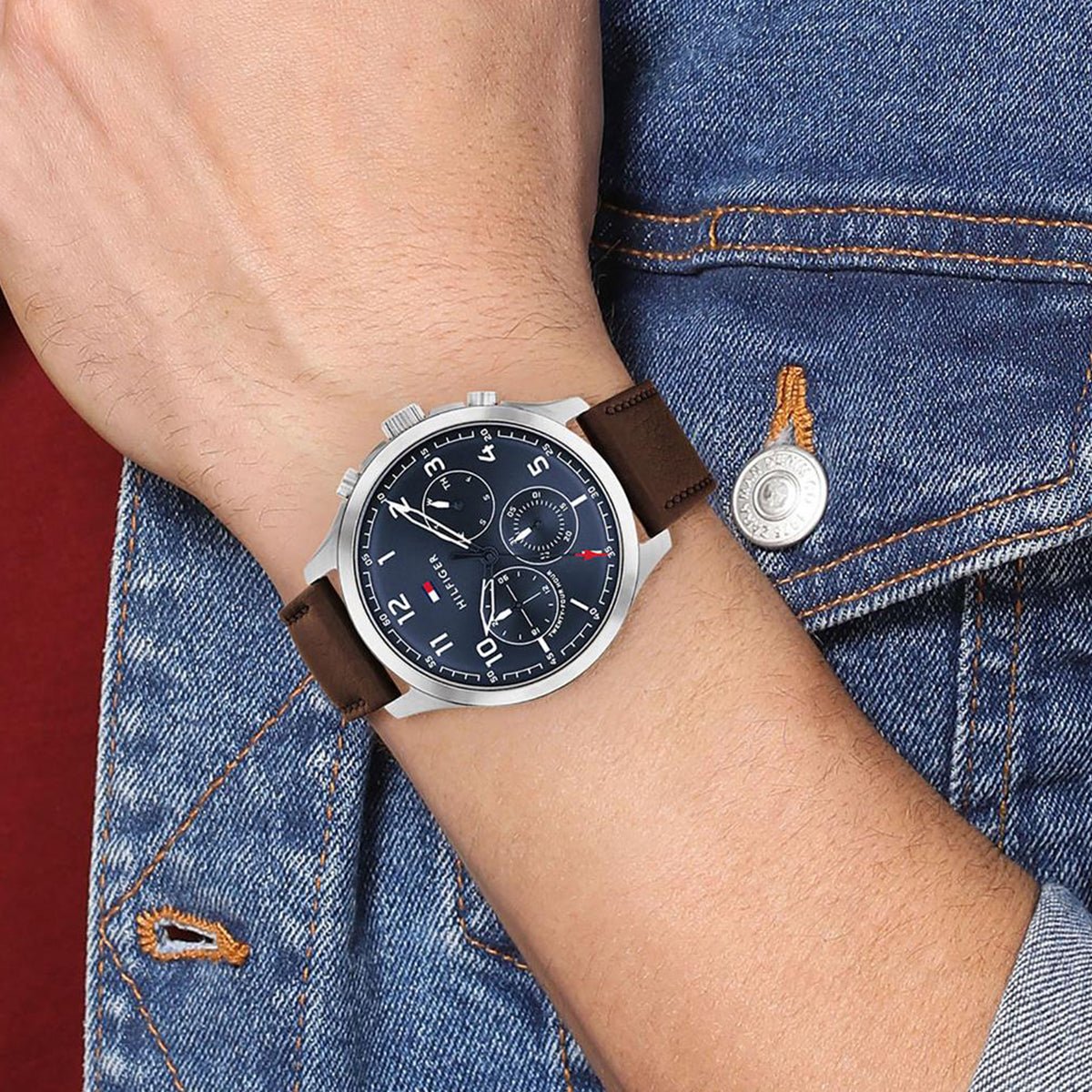 A casual but edgy take on the Iconic Tommy Style. The 44mm case is available in various finishes including stainless steel, Blue IP, Grey IP, and Black IP. The multifunction dial features dome sub-eyes with a circular brushed texture. Attached to a bracelet, mesh, or leather straps. 5 ATM/ 50 Meters.