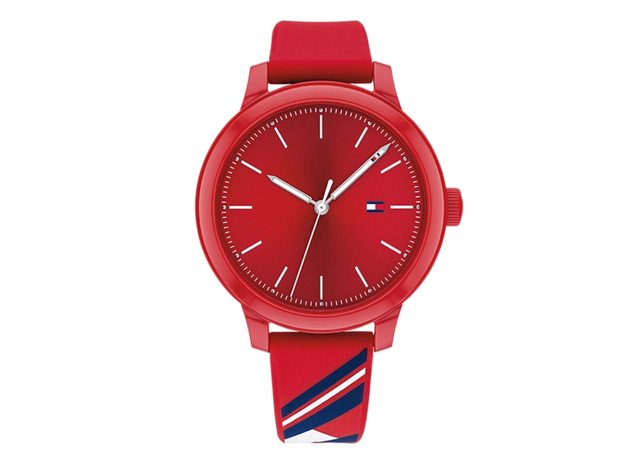 Tommy Hilfiger women's watch. Time after time, our sport watch delivers. This version offers sweeping 3-hand movement, and a durable silicone strap with a bold rendering of our iconic flag. 38mm red case and dial, red silicone strap.