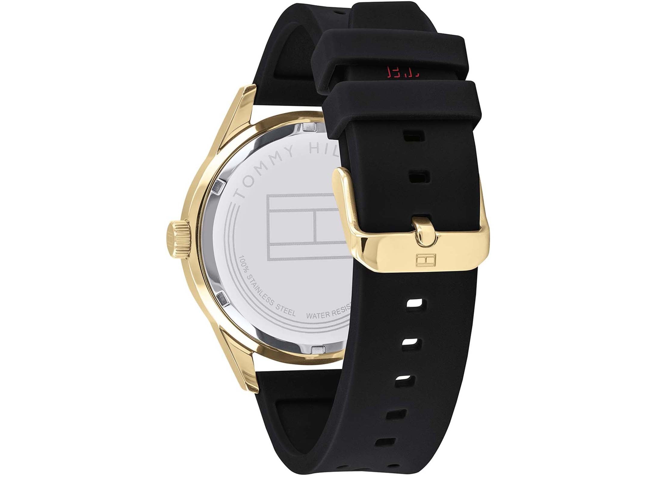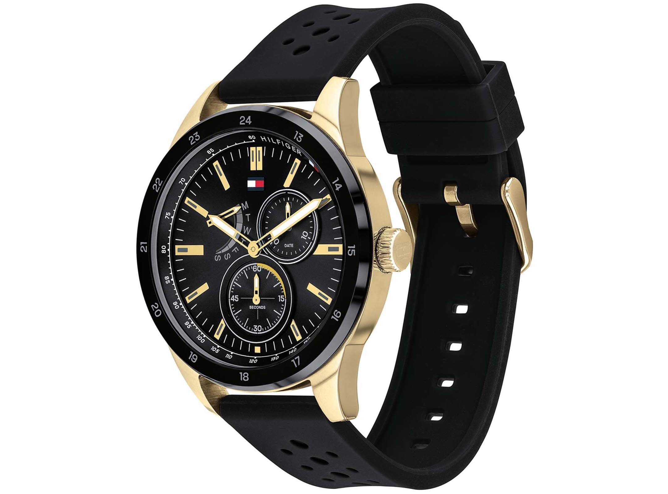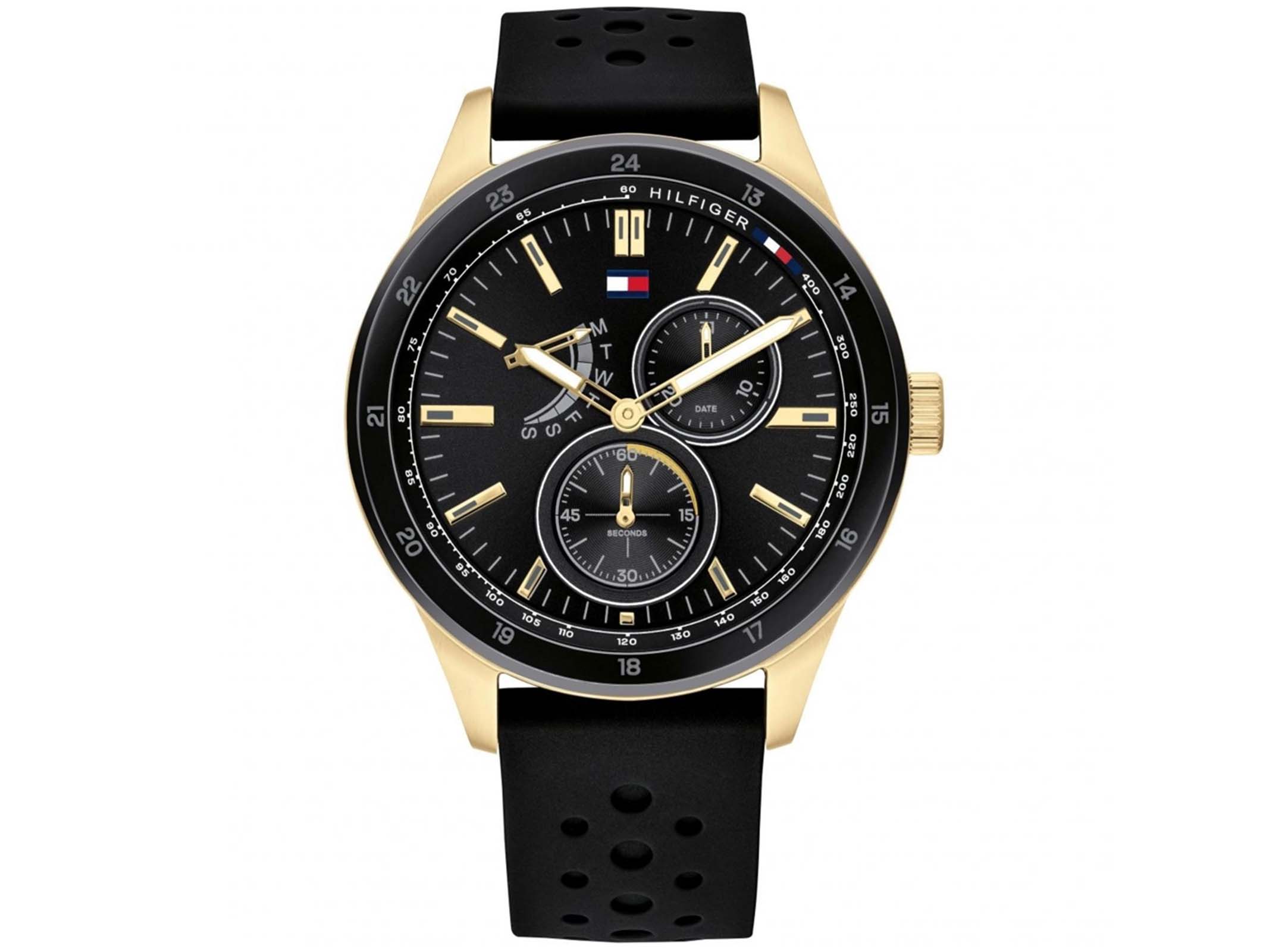 This Men's Tommy Hilfiger Austin Watch has a gold tone stainless steel case, black dial and a black silicone strap. The day date and seconds are on sub-dials