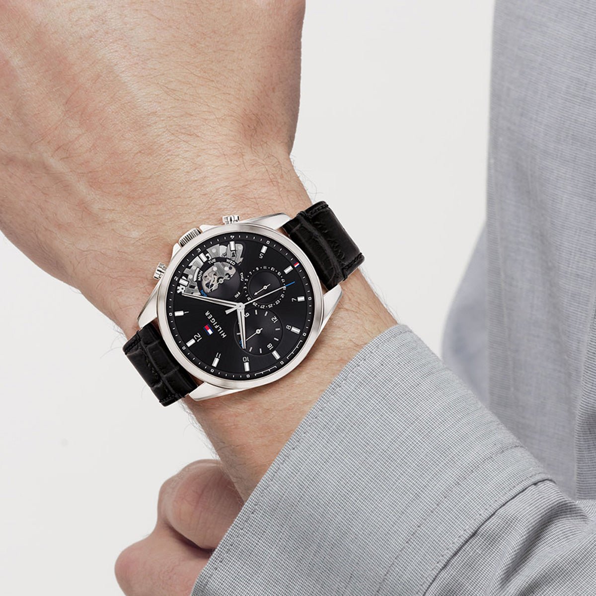 A dressed watch with attitude. This collection features a fresh asymmetric skeleton dial with an integrated bracelet, or matte faux croc leather strap. The asymmetric skeleton dial is within a 44mm case. Available in stainless steel, black IP, carnation gold-plated, and gold-plated finishes. 5 ATM/ 50 Meters.