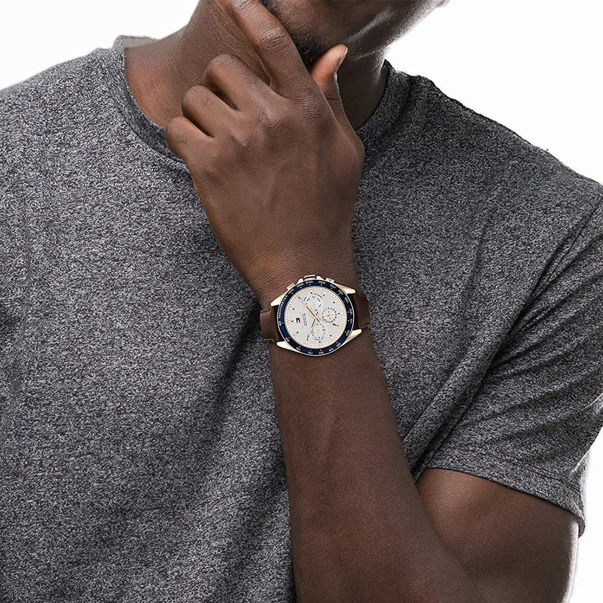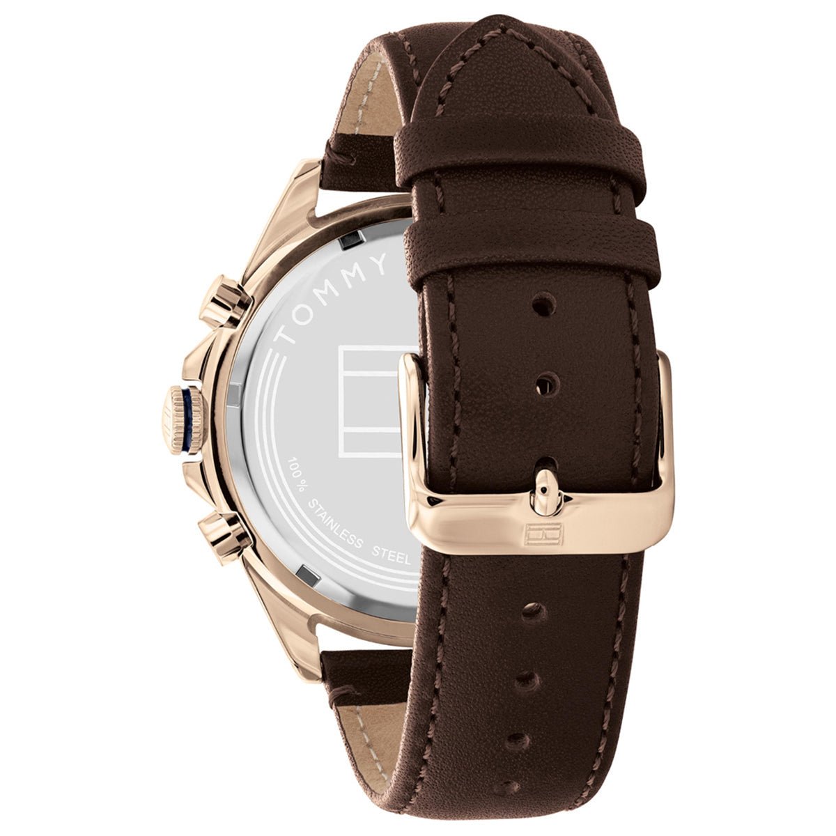 Quality Materials: Tommy Hilfiger Men's, 46 mm pale rose gold ionic plated stainless steel case, silver white dial with index, brown leather strap. Quartz Multifunction: It’s a battery-powered watch that sends energy through a quartz crystal. It is typically built into three separate dials for the day of the week, date of the month and 24-hour time. Durable Mineral Crystal: Made from glass and protects watch from scratches.