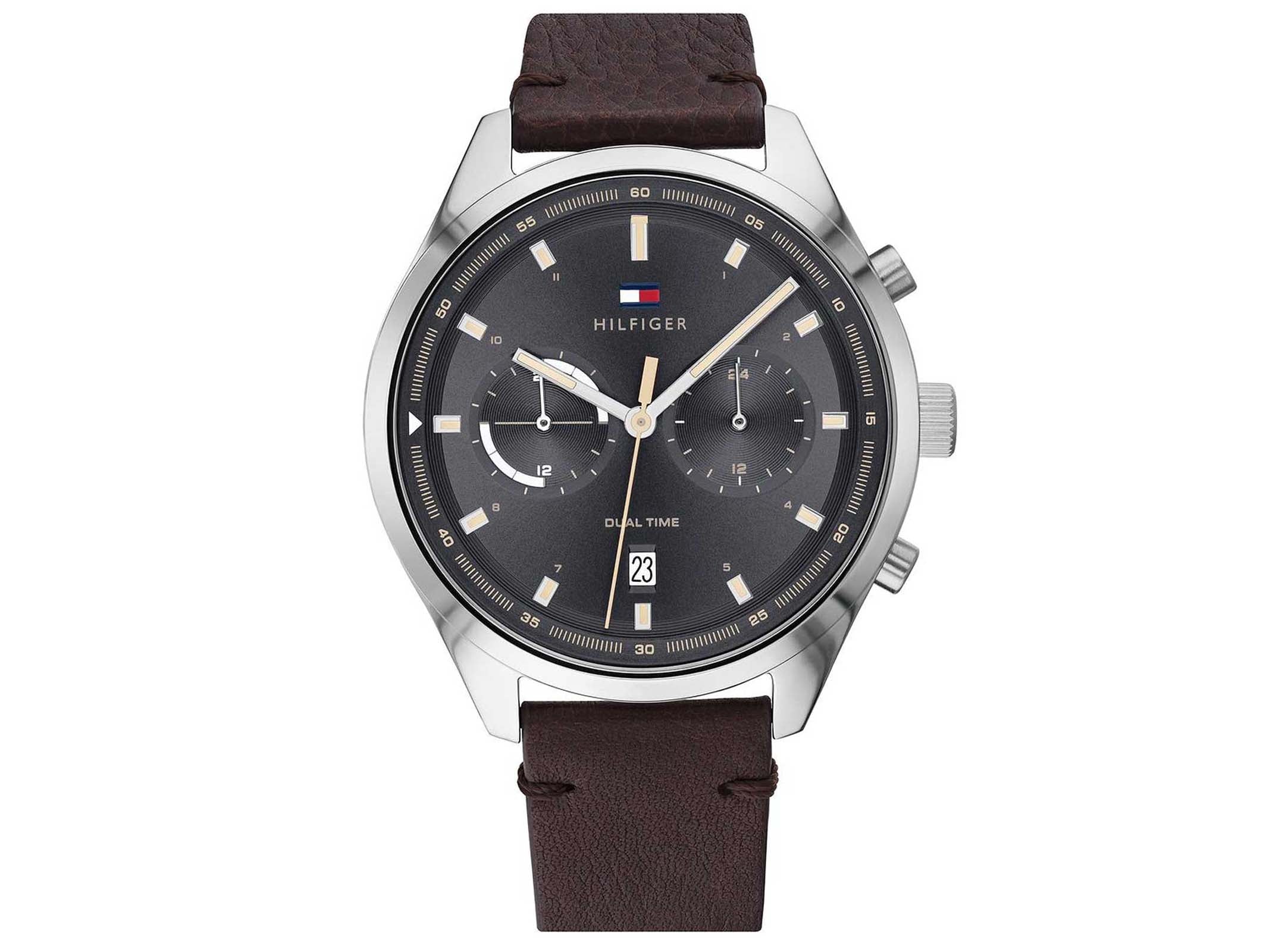 Modern Tommy Hilfiger Mens watch 1791729 . Colors > Dial: Grey, Strap: Brown, Case: Silver. Very comfortable Calf leather strap. The water resistance is 5 ATM. A scratch proove hardened, Mineral glass protects your watch from involuntary injuries. The 1791729 Mens watch from Tommy Hilfiger has the following functions: 24-hours, Date, Minute, Second, Hour, 2nd timezone.