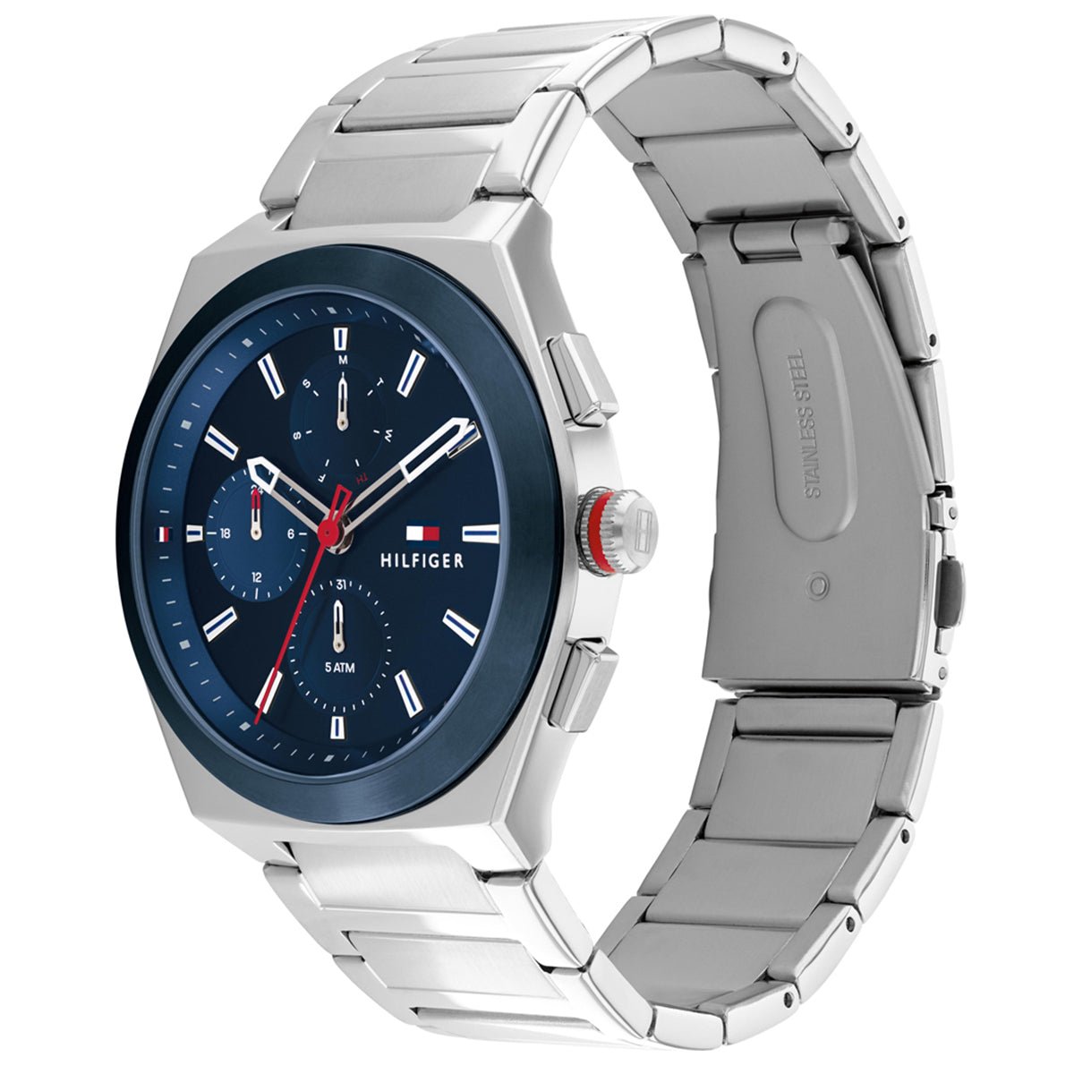 This Tommy Hilfiger watch has a stainless steel case 44mm in diameter and is fitted with a metal strap. Inside the case lies a movement and the watch features a mineral crystal.
