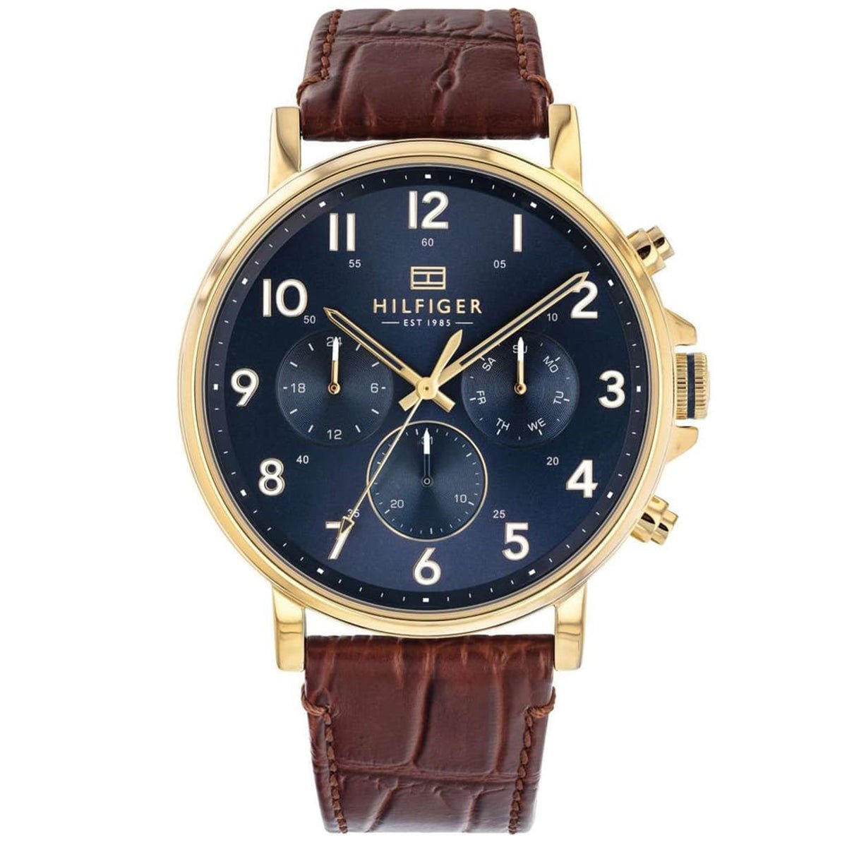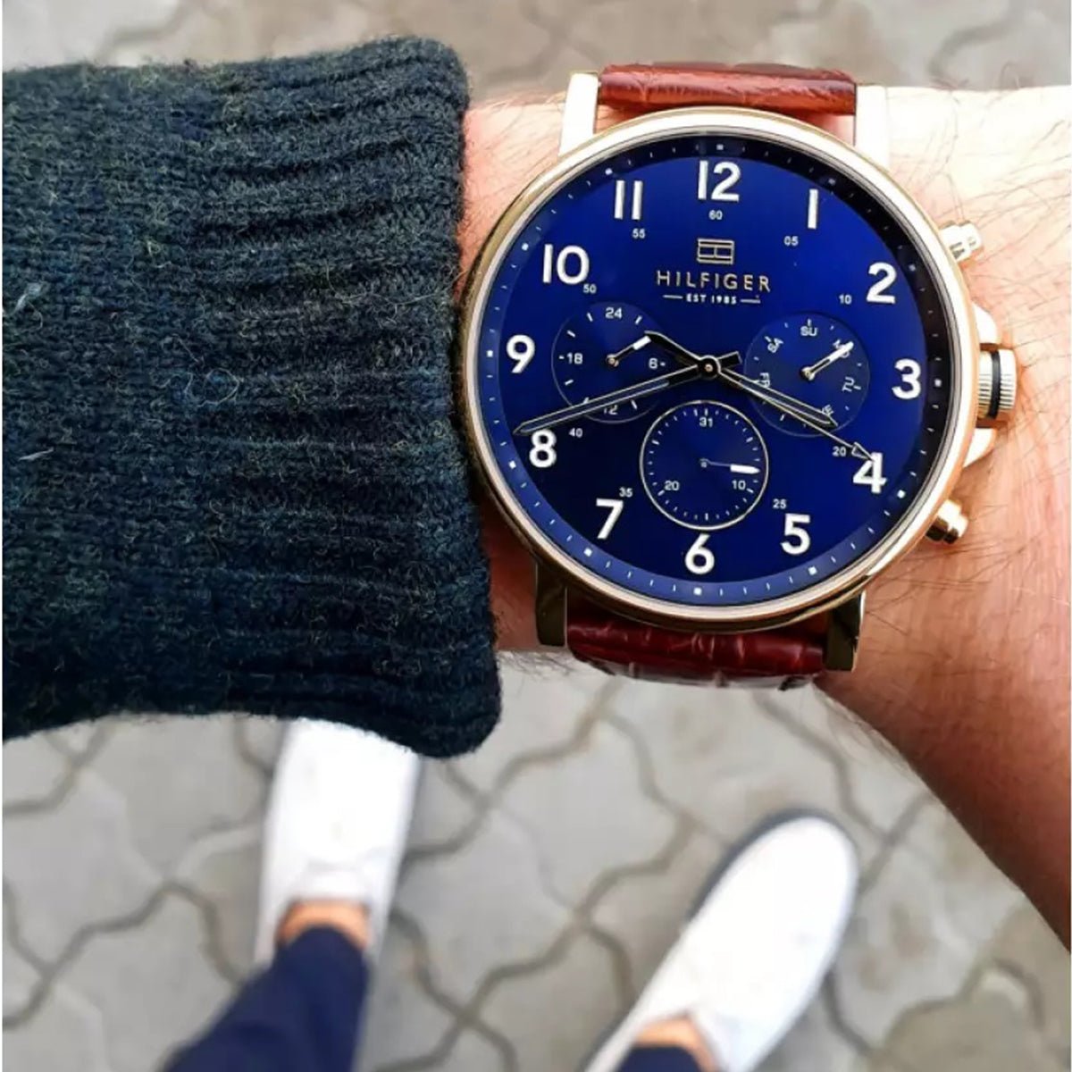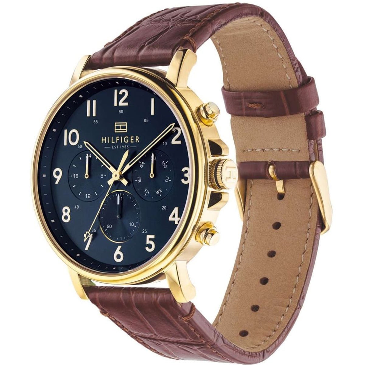 Classic Tommy Hilfiger Men watch 171.0.380. Colors > Dial: Blue, Strap: Brown, Case: Gold. Very comfortable Calf leather strap. The water resistance is 5 ATM. A scratch prove hardened, Mineral glass protects your watch from involuntary injuries.
