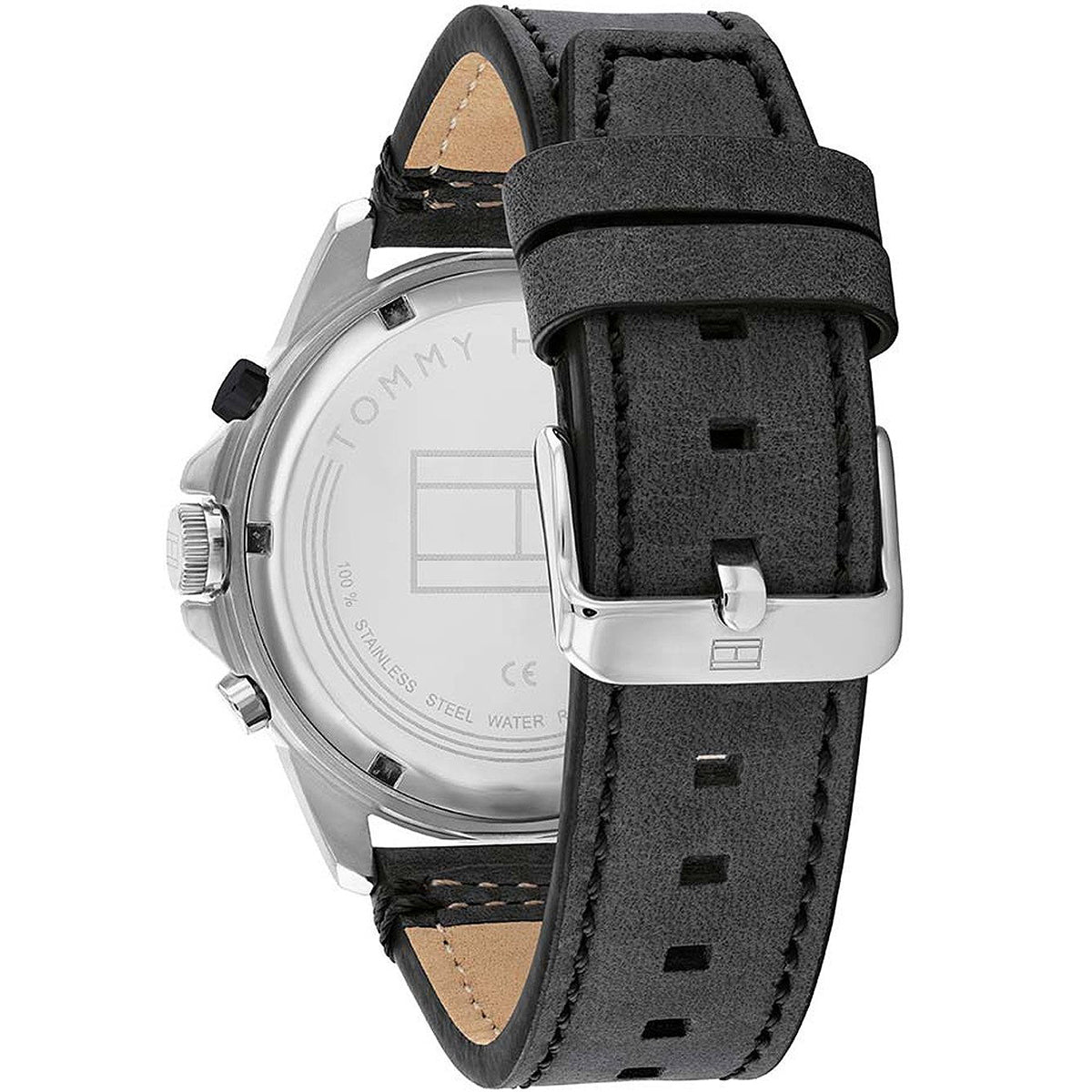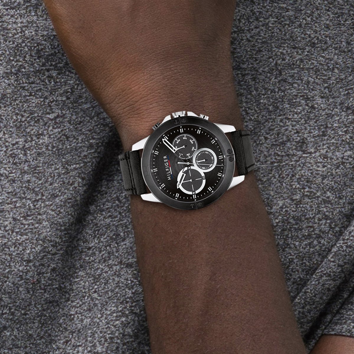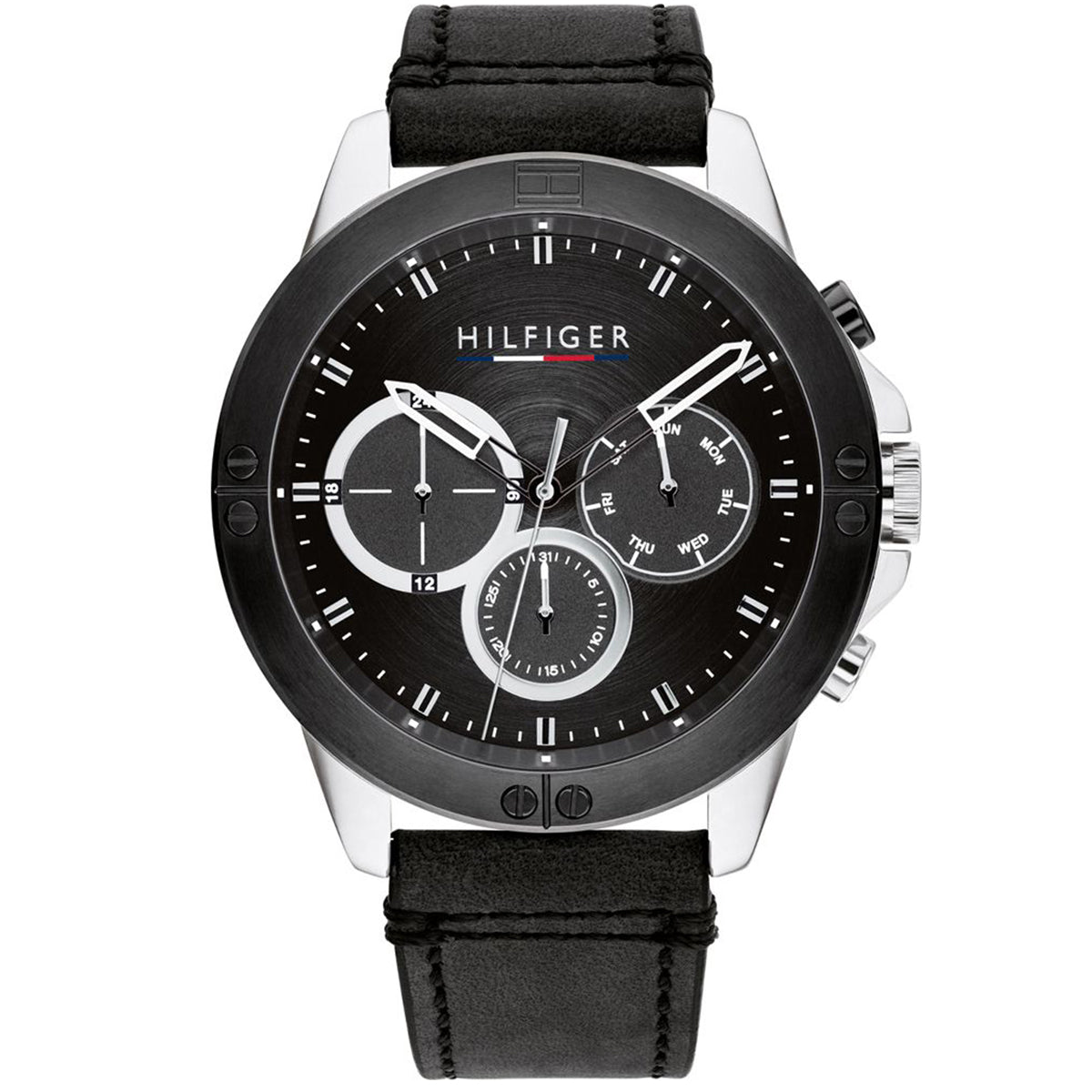 This Tommy Hilfiger watch has a stainless steel case 46mm in diameter and is fitted with a leather strap. Inside the case lies a movement and the watch features a mineral crystal. The watch is 5ATM. This means the watch is suitable for showering.