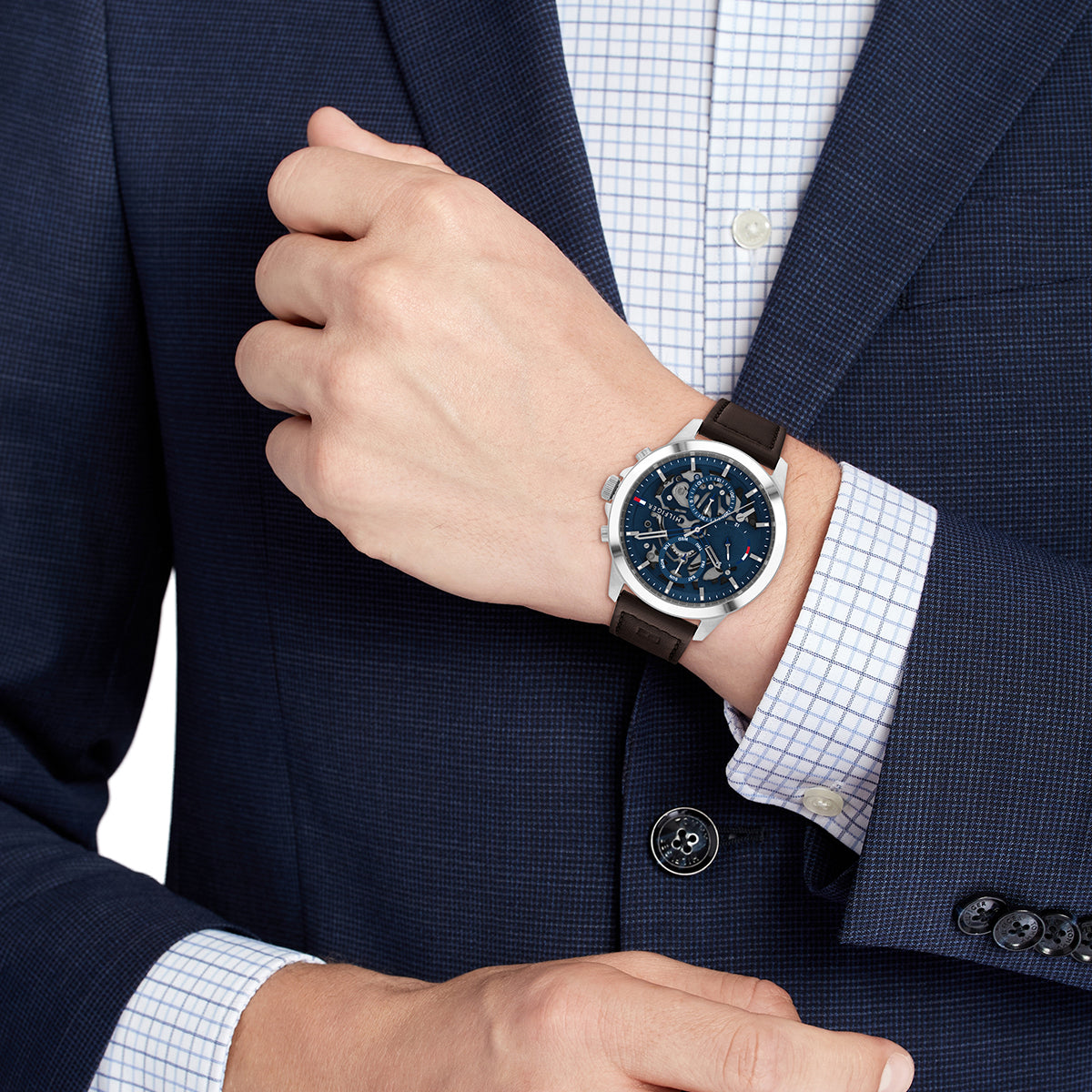 This Tommy Hilfiger watch has a stainless steel case 44mm in diameter and is fitted with a leather strap. Inside the case lies a movement and the watch features a mineral crystal.