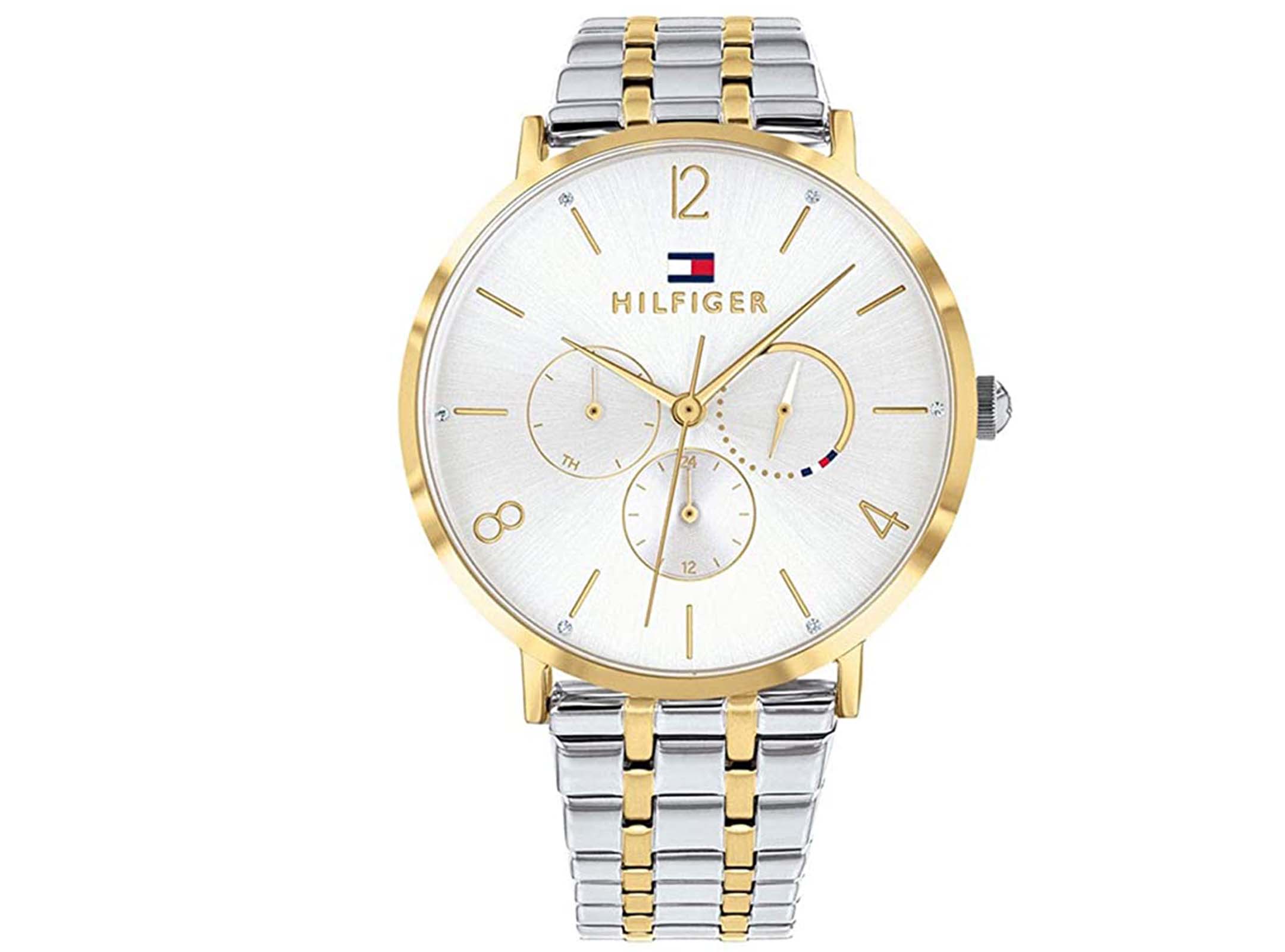 Just the right touch of sophistication. This sunray multi-function dial is minimal and sleek. Crafted from solid stainless-steel with gold-toned finishes, the 40mm case is paired with a two-tone silver and gold metal link bracelet. The Tommy Hilfiger flag is positioned at 12:00.