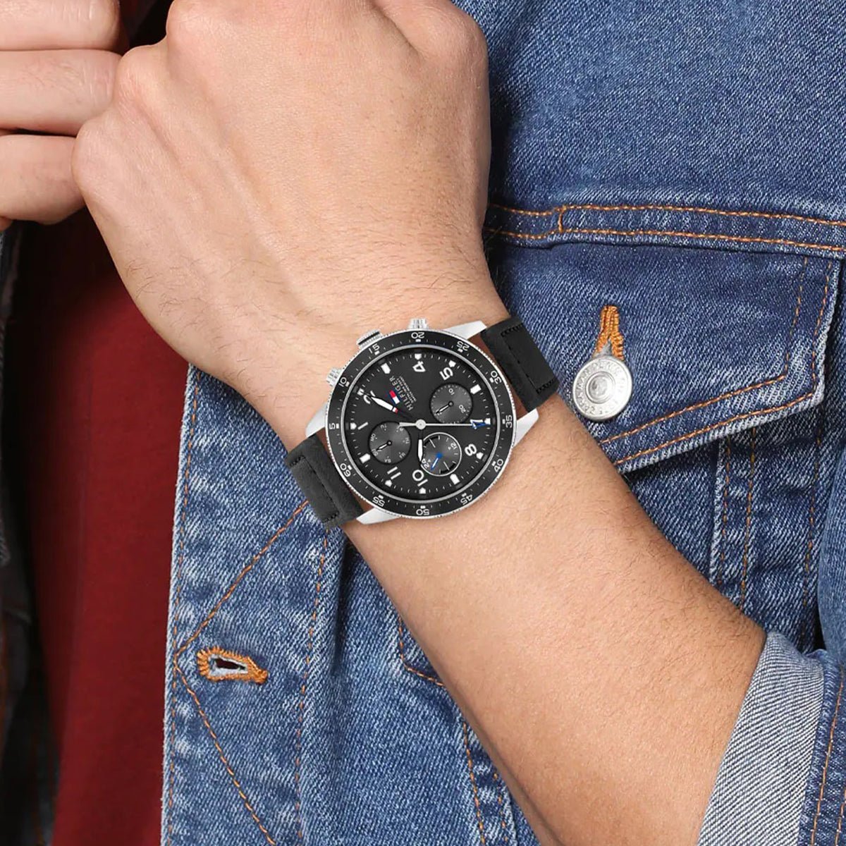 Aviator inspired, nostalgic and distinctive. Whether adventuring across town or across the tarmac this casual watch will keep you perfectly on time. Boldly styled with case and lugs, Sunray dial with flag accents and an arrow sweep. Integrated link bracelets and leather straps with a trio of sub-dials showing days of the week, date and 24-hours. 44mm.