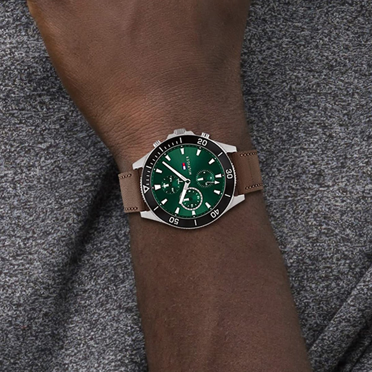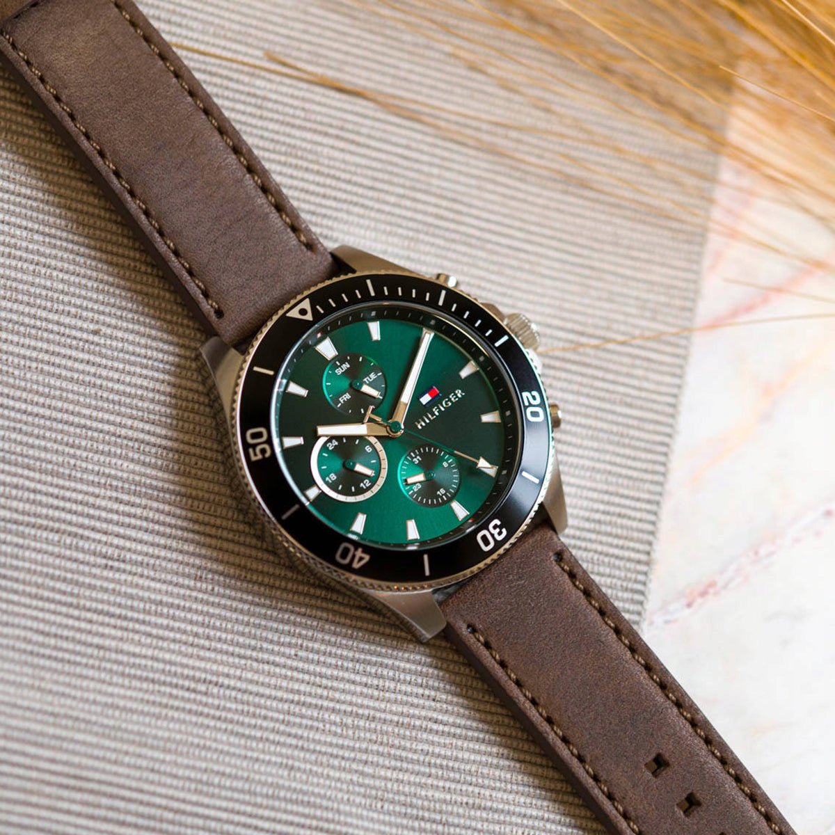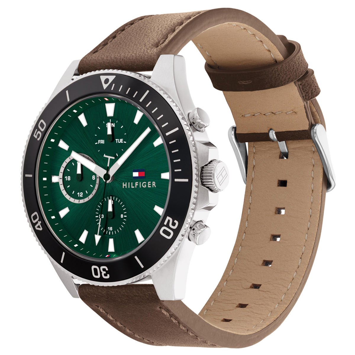 This Tommy Hilfiger watch has a stainless steel case 46mm in diameter and is fitted with a leather strap. Inside the case lies a movement and the watch features a mineral crystal.