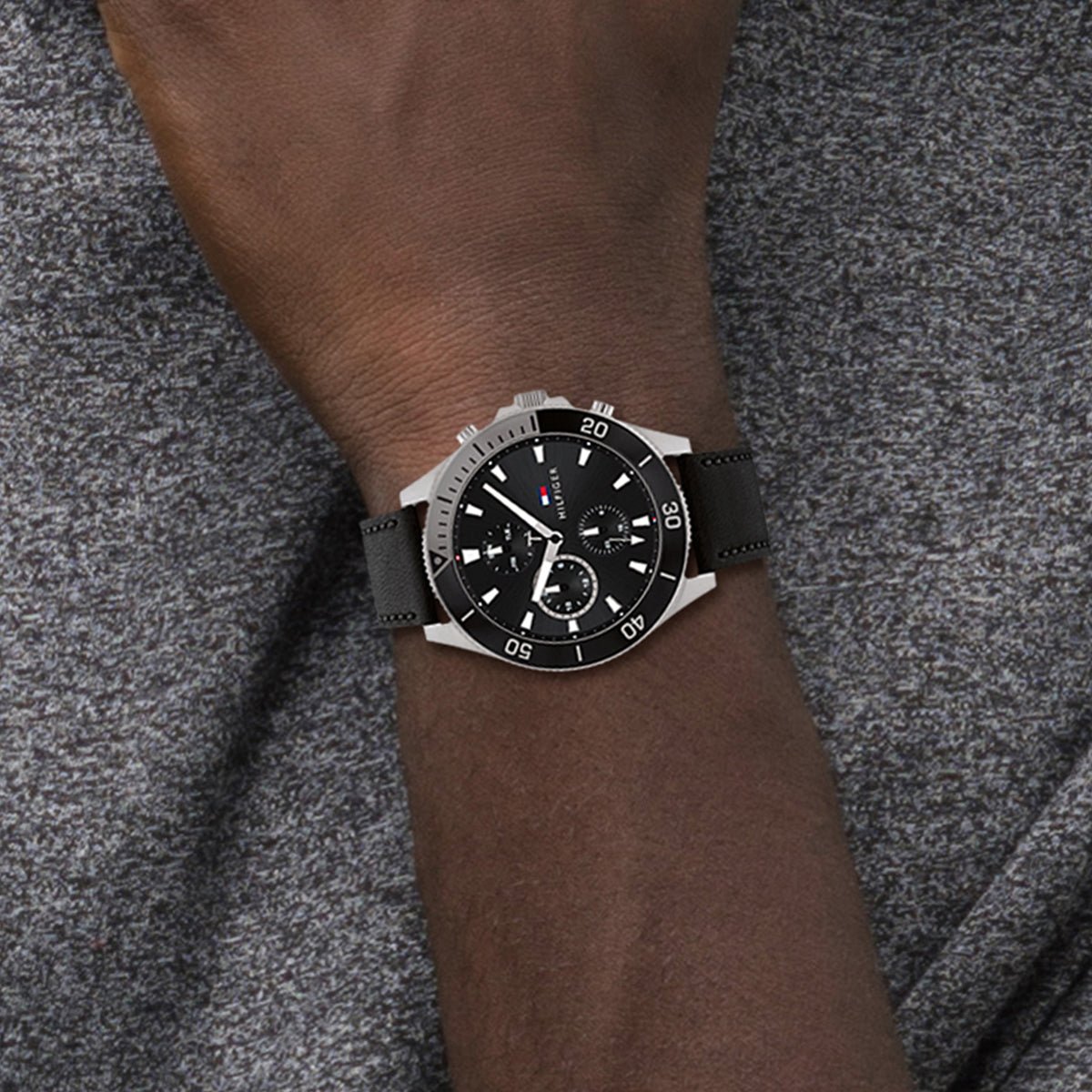 This Tommy Hilfiger watch has a stainless steel case 46mm in diameter and is fitted with a leather strap. The watch case contains a movement and a mineral crystal. The watch is 5ATM water resistant. This means that the watch is waterproof for the shower.