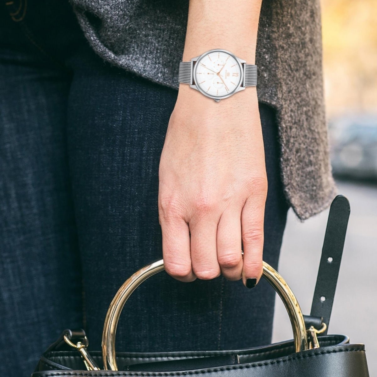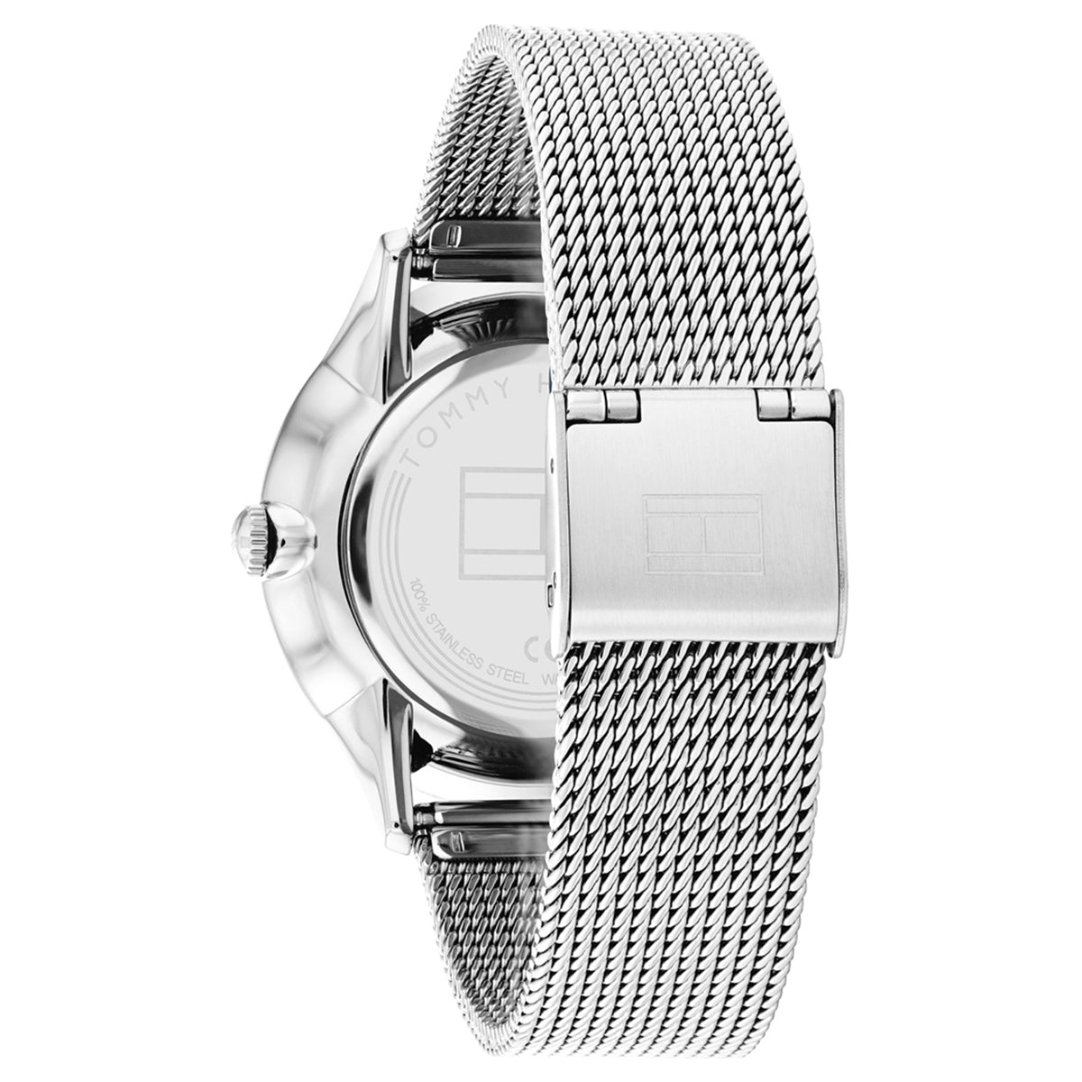 Women's Chronograph Watch from the Layla Collection By Tommy Hilfiger. Chronograph Watch With Round Case Of Size 38Mm Of Silver Color Made Of Silver Steel. The dial is white. The glass is mineral. The strap is in silver-colored mesh steel. Functions: Multifunction. The Resistance to Water is 3 Atm. The reference is 1782456.