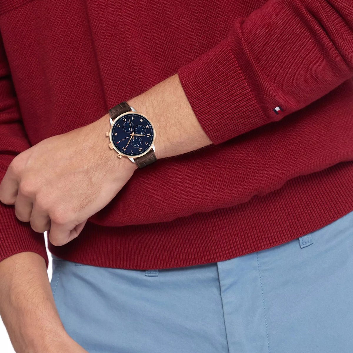 Nice men's watch from the world-renowned fashion brand Tommy Hilfiger. The watch has a quality leather strap in brown which goes well with the dial in blue with the highlighted markings. The watch has three chronographs. All in all, this is a nice men's watch that can be used both for everyday use, but also for more festive occasions. The watch measures 44 mm in diameter and is water resistant down to 5 ATM.