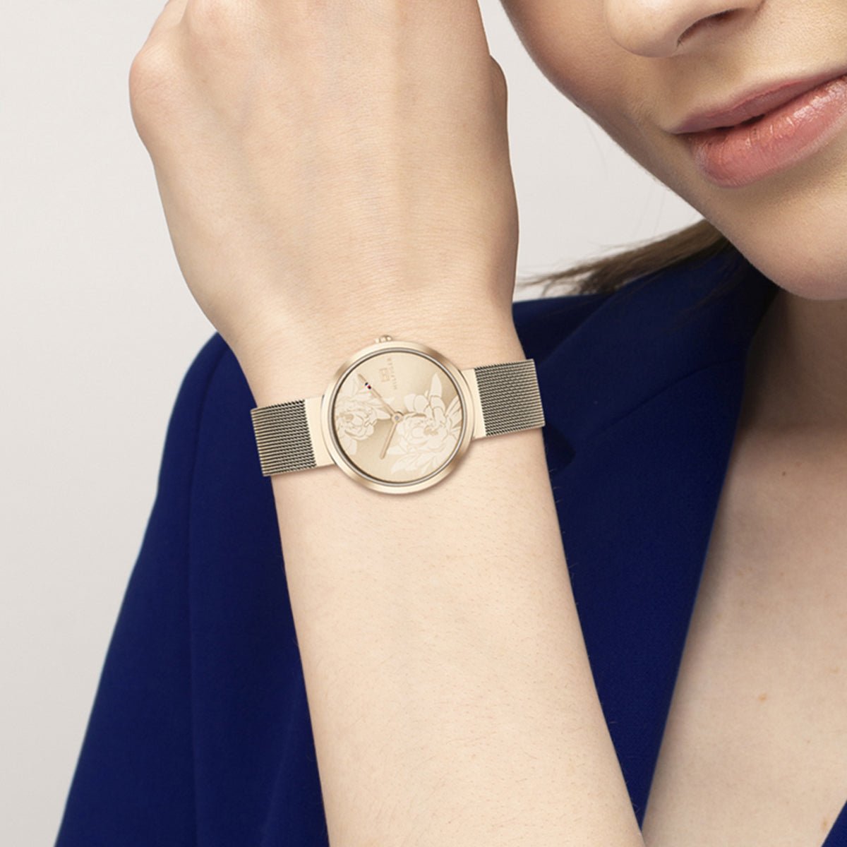 This Tommy Hilfiger watch has a stainless steel case 32mm in diameter and is fitted with a metal strap. Inside the case lies a movement and the watch features a mineral crystal. The watch is 3ATM. This means the watch is splash waterproof.